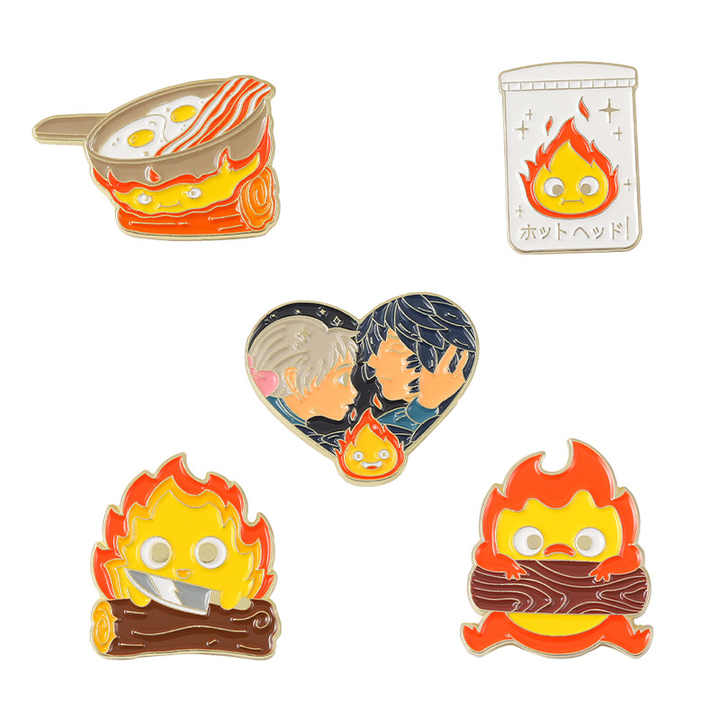 5 diseño de alta calidad Anime Howl Moving Castle Fire Calcifer Cloisonne pintado aleación broches alfileres artesanías de Metal