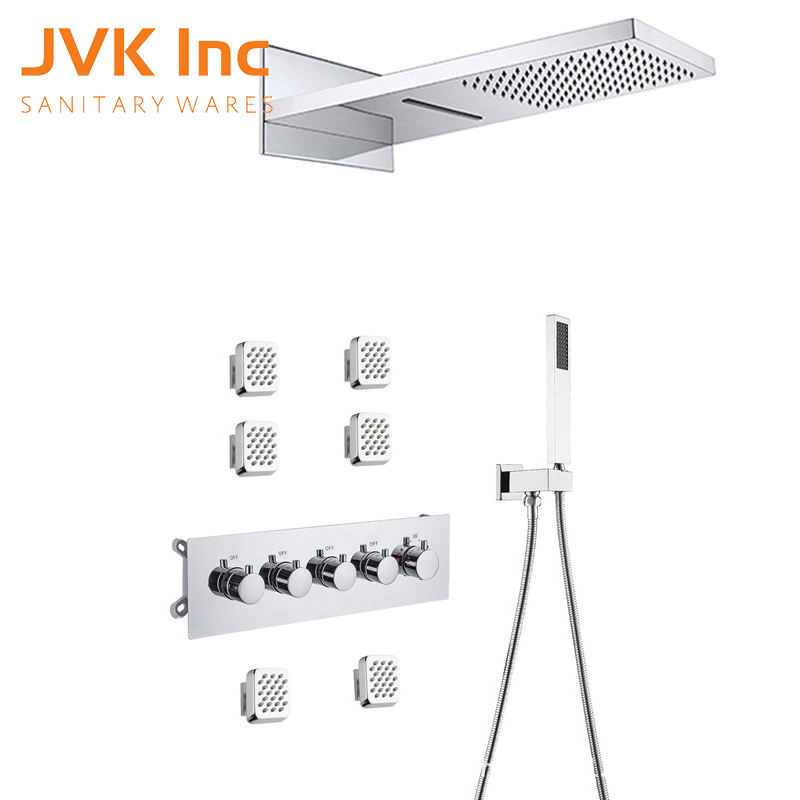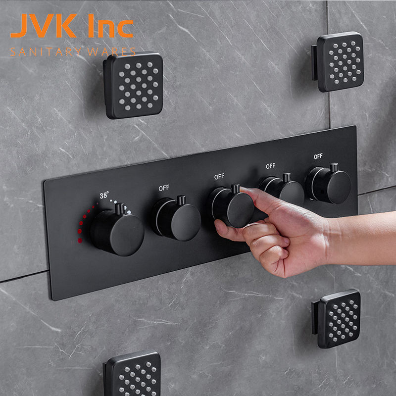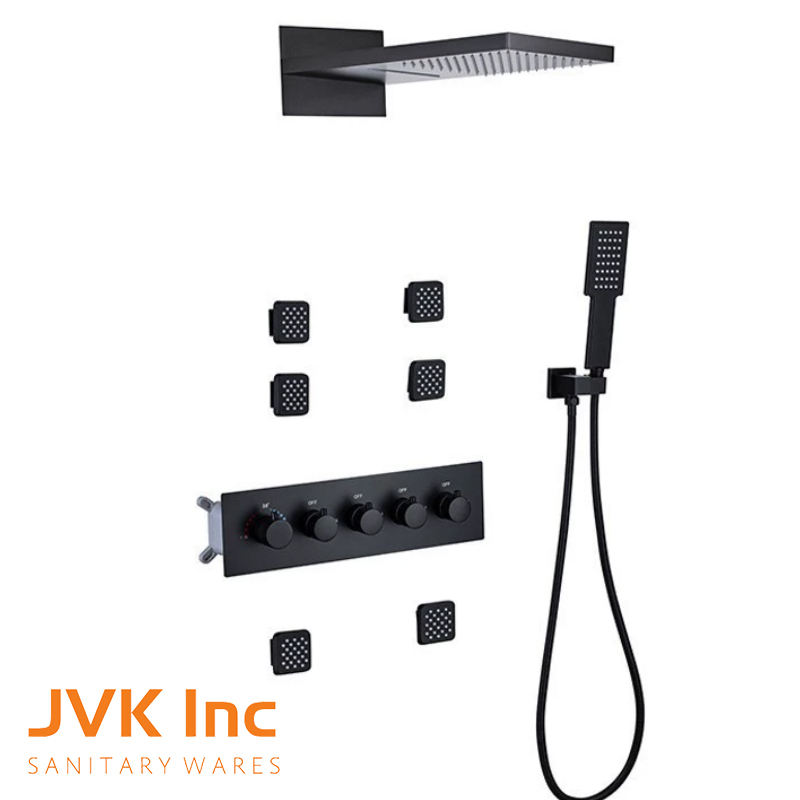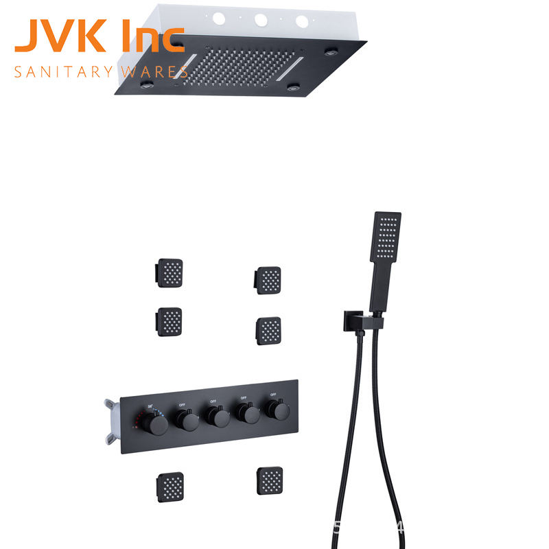 Sistema de ducha completo de 5 funciones, mezclador de cabezal de ducha de lluvia fría y caliente negro, juego de ducha completo termostático, termo para Baño