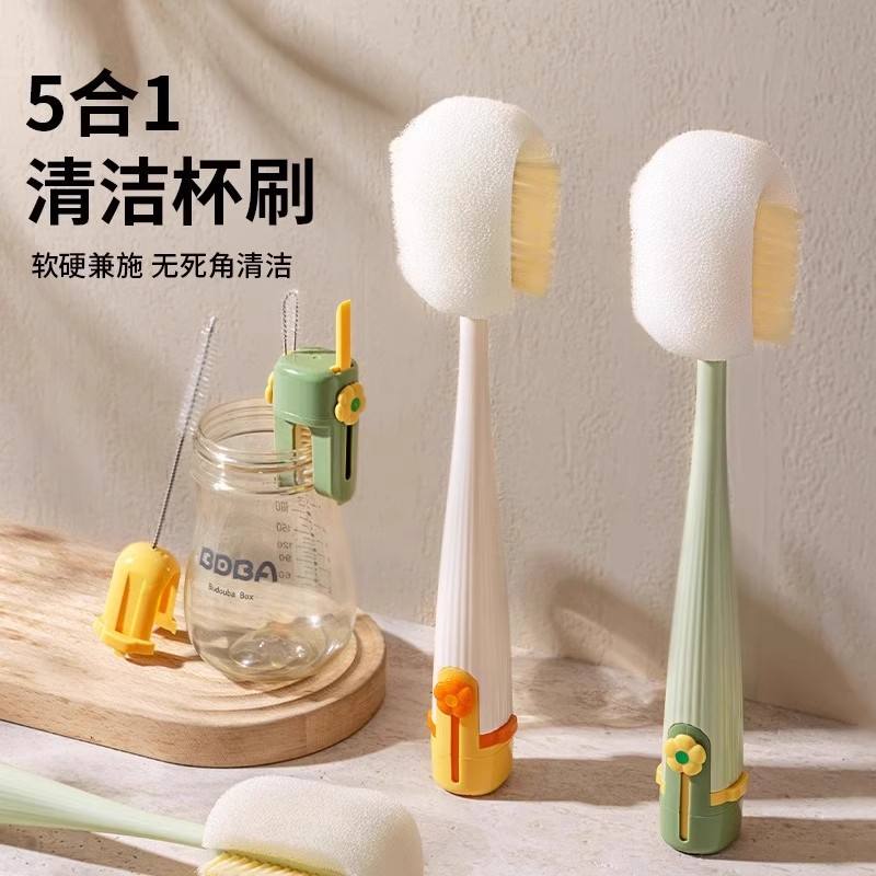 Cepillo de limpieza 5 en 1 con mango largo y cabezal de esponja para limpiar tapas de botellas y termos
