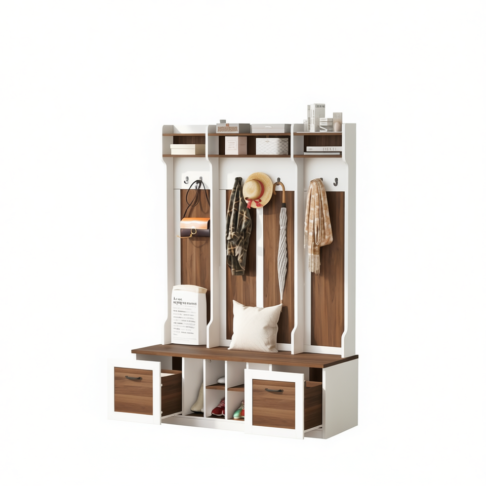 Perchero de recibidor 5 en 1 de 58.8 pulgadas con 7 ganchos, 2 cajones y estantes ajustables para entrada y sala de estar
