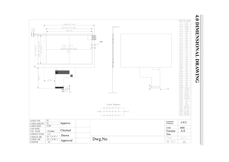 Panel LCD TFT de 5 Pulgadas, 800X480 RGB 24bit, Pantalla Táctil