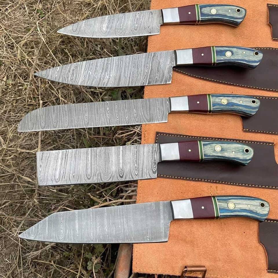 Juego de cuchillos de Chef de Damasco hecho a mano, mango de madera dura personalizado de fábrica, hoja fija, 5 uds.