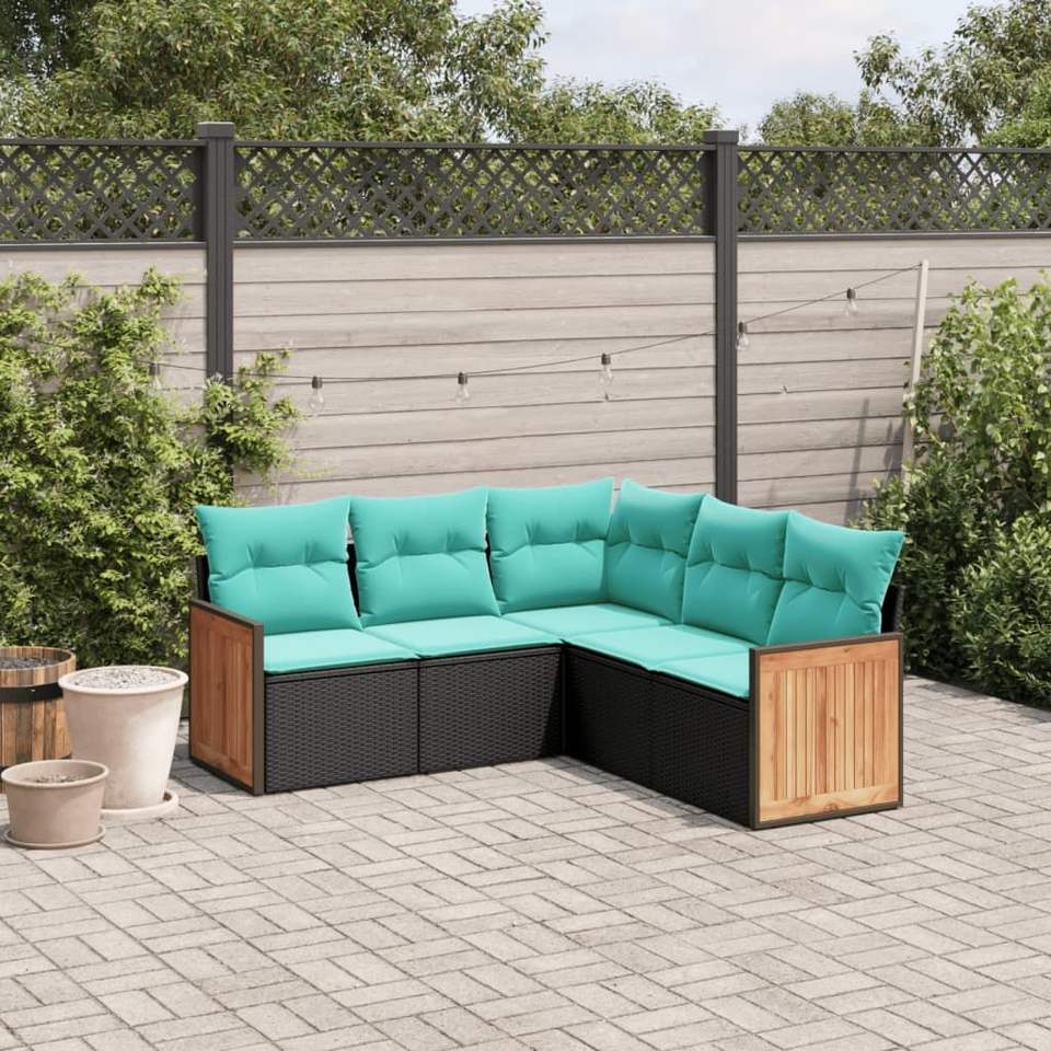 Juego de sofás de patio de ratán sintético negro de 5 piezas con cojines, elegantes muebles de exterior