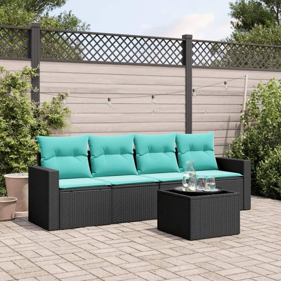 Juego de sofás de patio de ratán sintético negro de 5 piezas con cojines, elegantes muebles de exterior