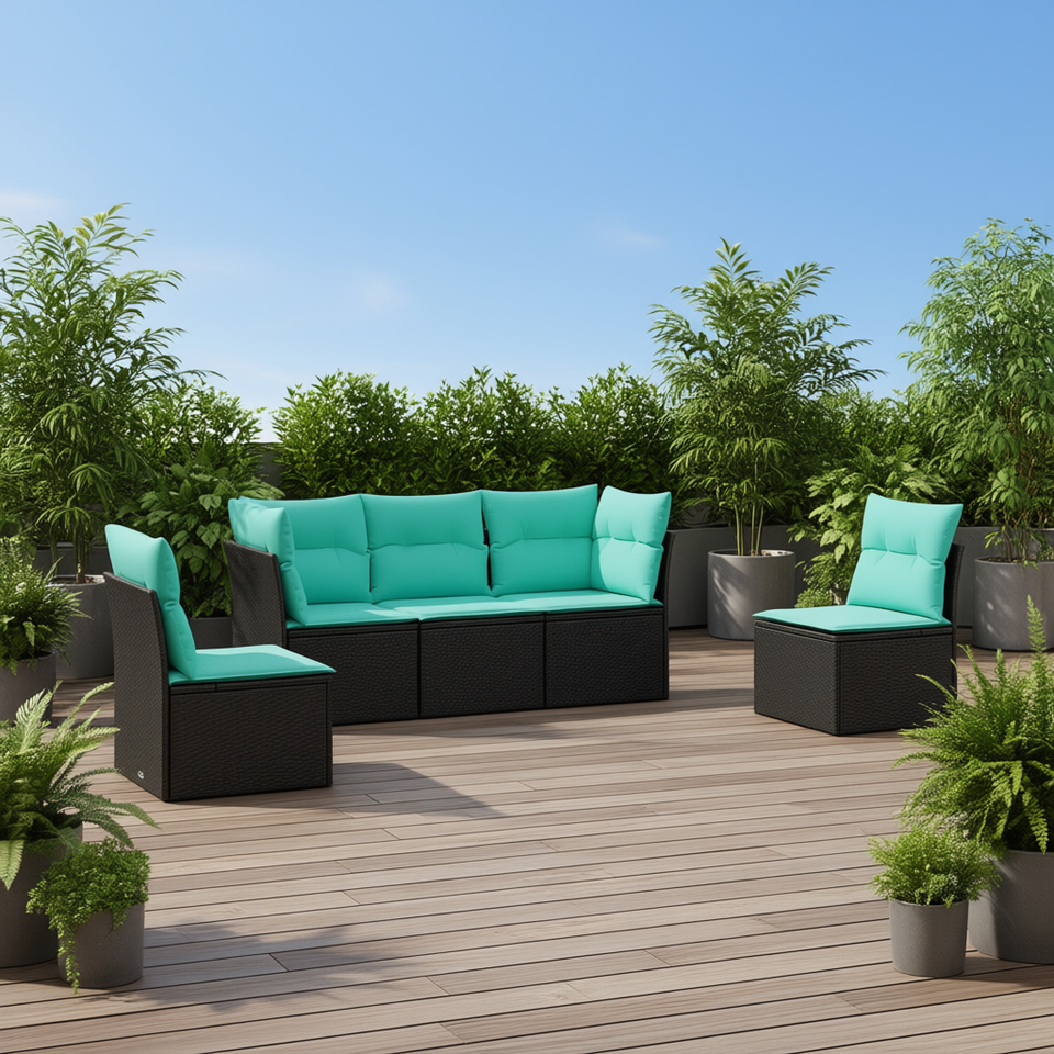Conjunto de Sofá Modular de Jardín de Ratán Negro, 5 Piezas, con Cojines, Muebles de Patio para Exteriores, Estilo Contemporáneo