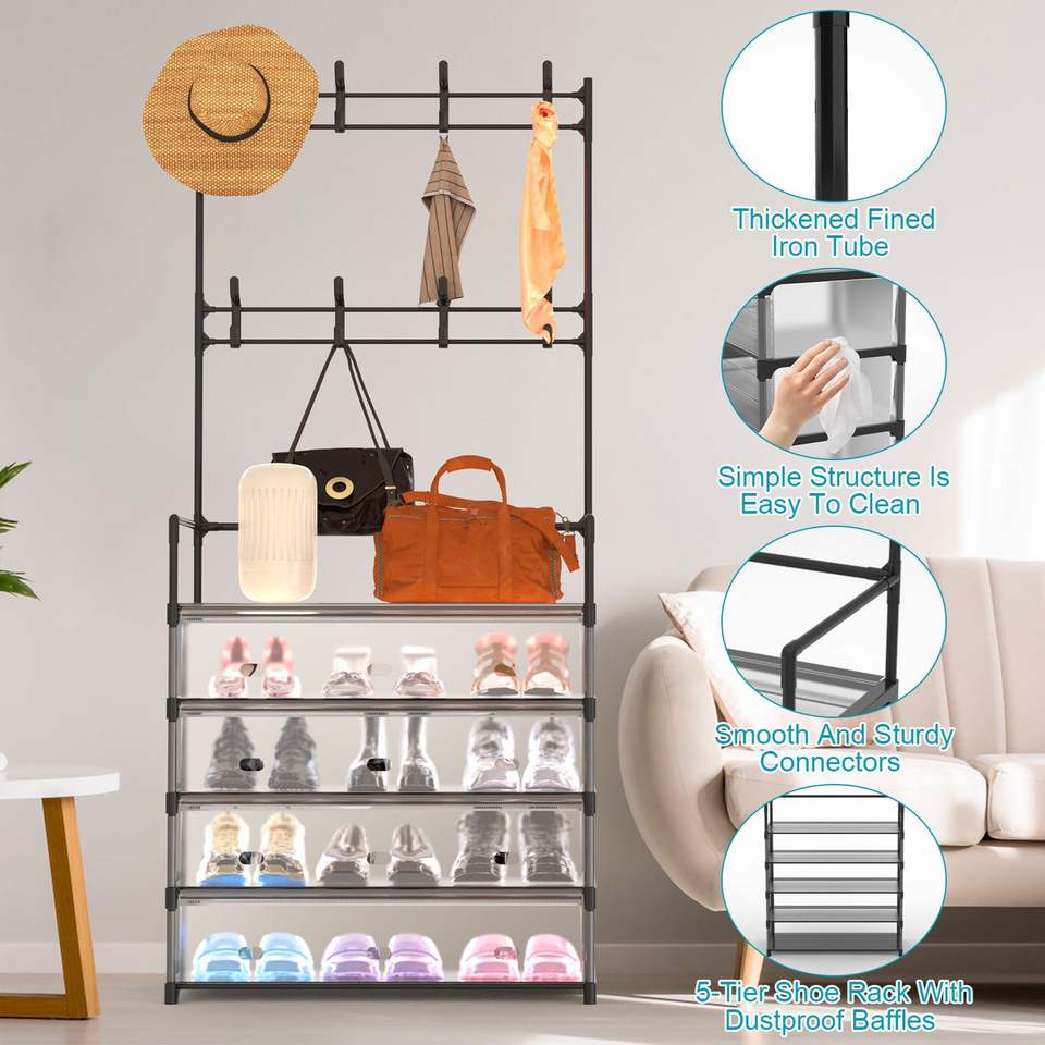 Zapatero Independiente de 5 Niveles con 8 Ganchos Extraíbles, Perchero de Entrada a Prueba de Polvo para Organizar Sombreros, Ropa y Zapatos