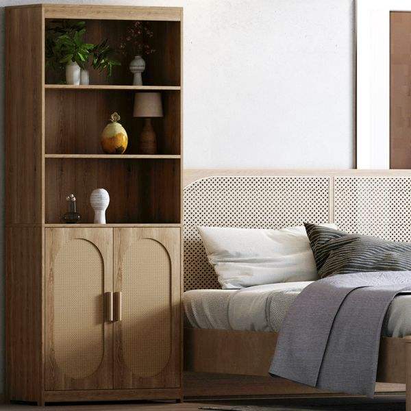 Estantería Alta de 5 Niveles con Ratán y Madera, Librería Grande con Puertas, Librería Estilo Rústico para Almacenamiento en Biblioteca