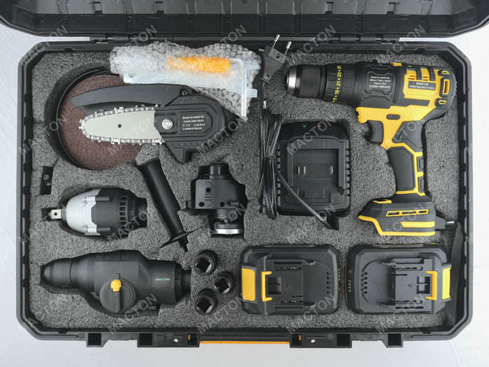Amoladora angular, Taladro inalámbrico, Sierra eléctricaHerramientas incluidas