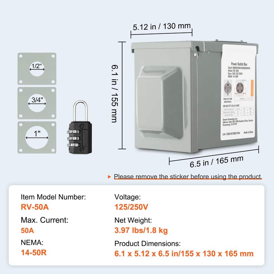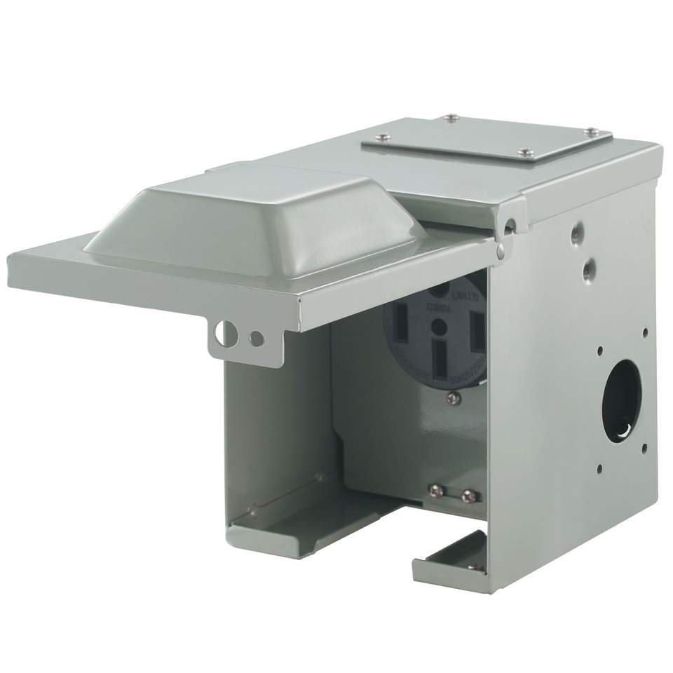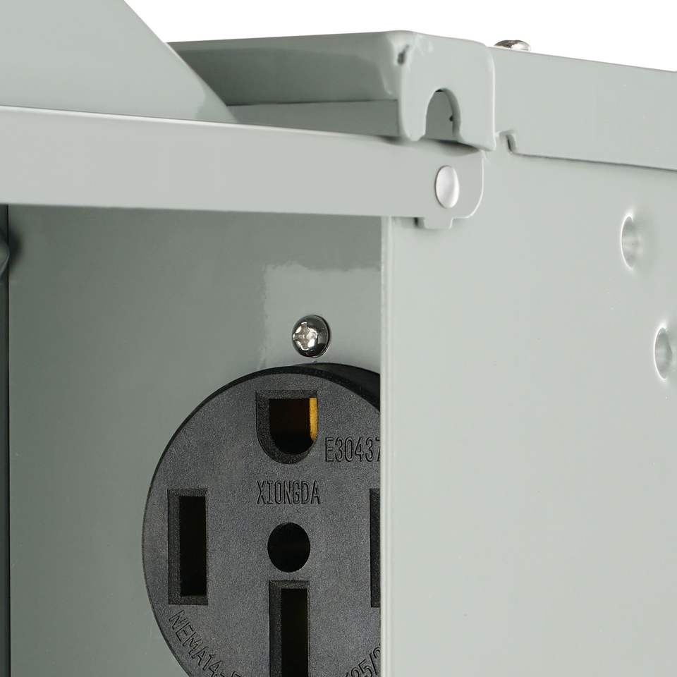 Caja de Tomacorrientes para RV de 50 Amperios, NEMA 14-50R, Panel Eléctrico Resistente a la Intemperie, 125/250 Voltios, Receptáculo Exterior para RV Cerrado y con Cerradura