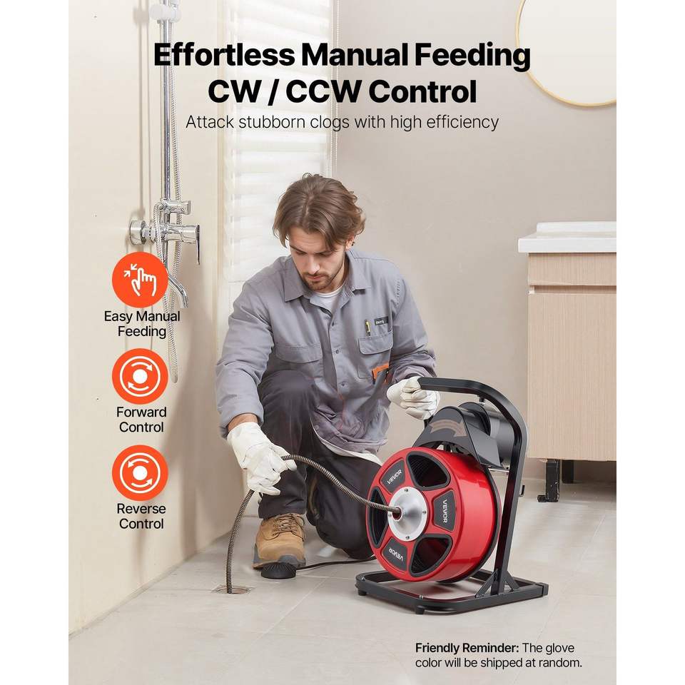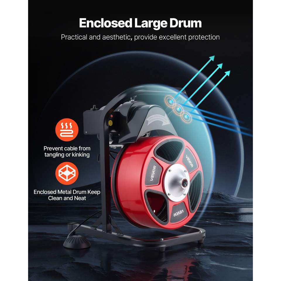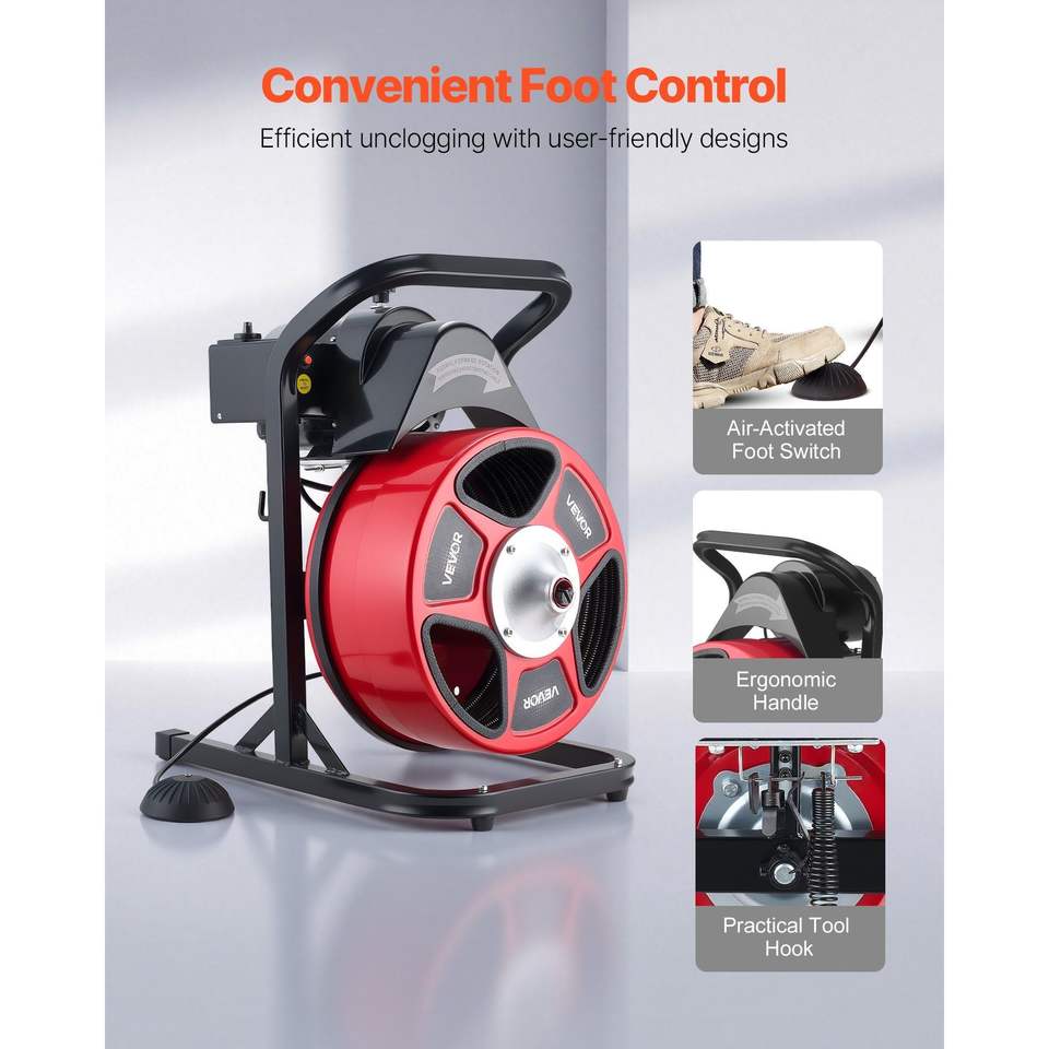 Máquina desatascadora de desagües de alimentación manual de 50 pies x 1/2 pulgada, con 4 cortadores, activación por aire, interruptor de pie de 2 a 6 pulgadas para tuberías