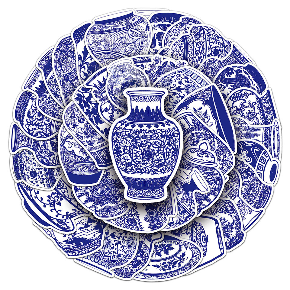 50 Uds. Directo de fábrica estilo chino personalizado PVC azul y blanco pegatinas de porcelana para equipaje nevera decoración pegatina