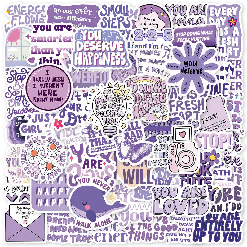 50 Uds. Pegatinas de grafiti de texto inspirador de Color púrpura para decoración de botellas de libros pegatina de frases positivas