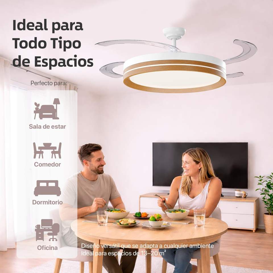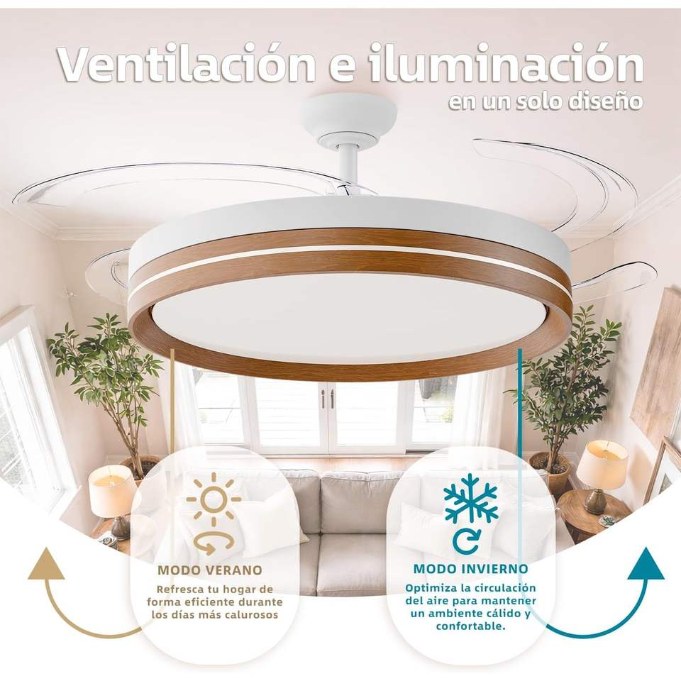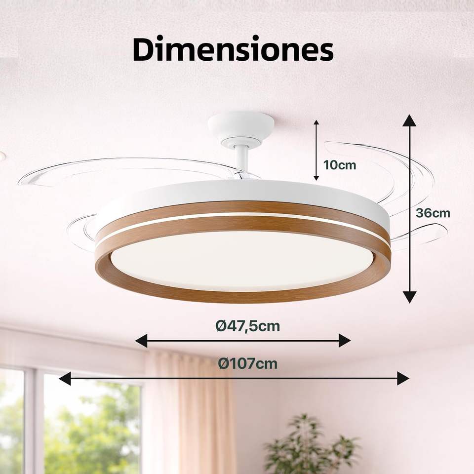Ventilador de Techo LED de 50 cm con Control Remoto y Aplicación, Motor DC, 66 W 8280 LM, Temporizador, 6 Velocidades, 4 Aspas Retráctiles, 3