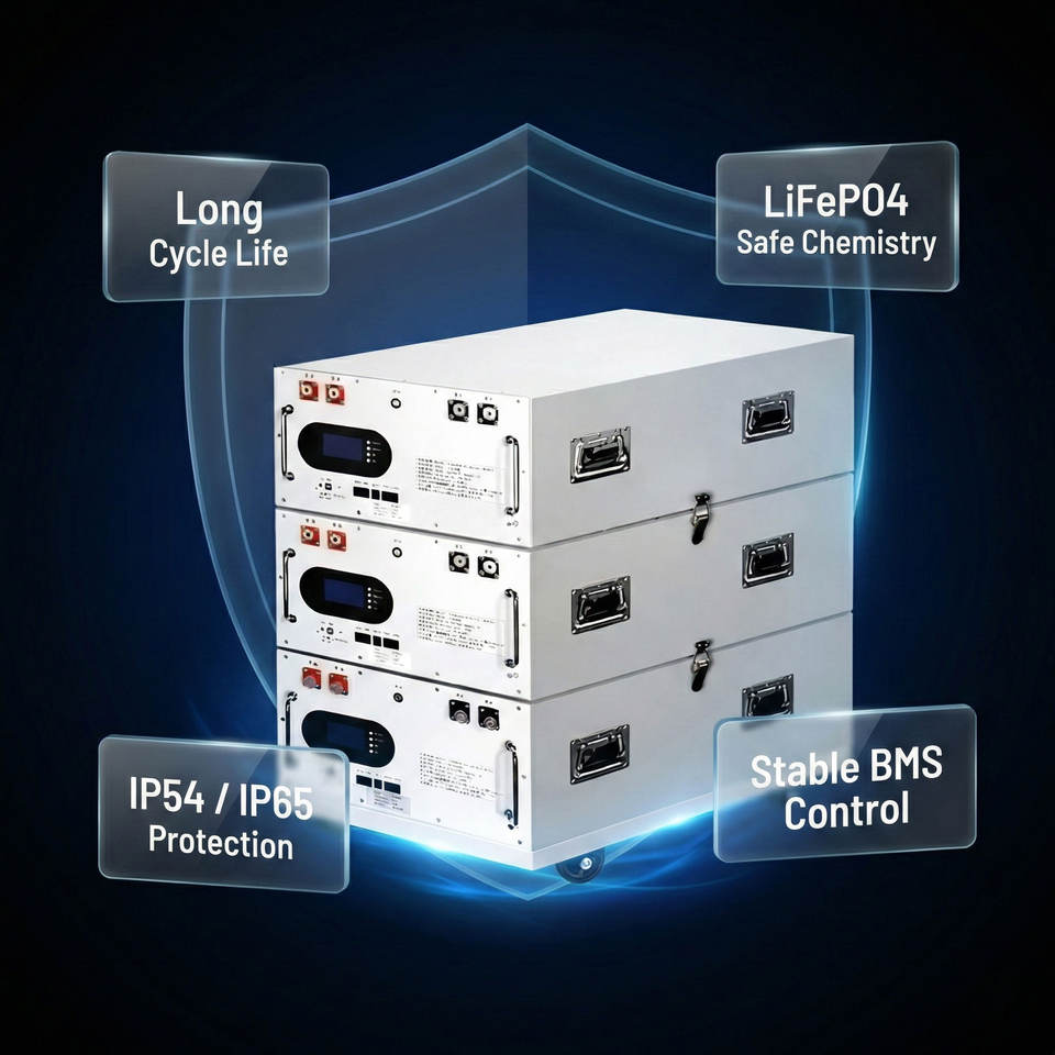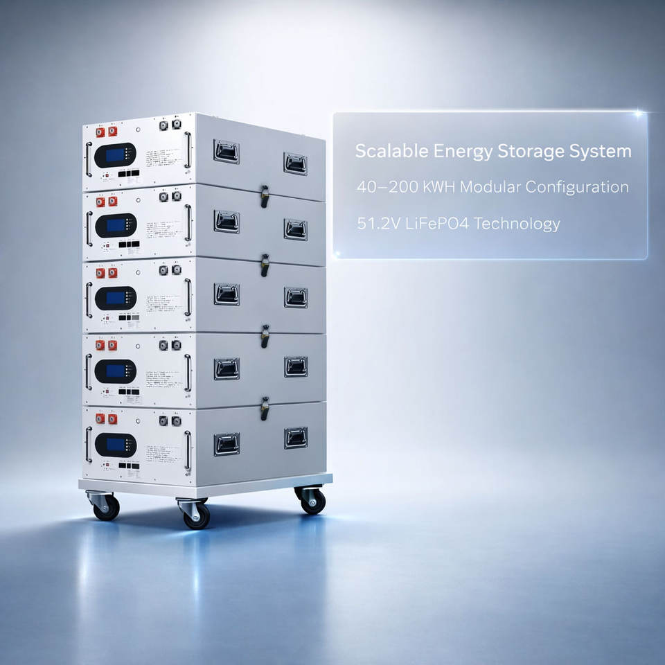 Sistema de Almacenamiento de Energía LiFePO4 de 51.2V para Montaje en Rack, 40-200kWh, para Hogar y Comercios, Híbrido y Fuera de la Red, CAN RS485