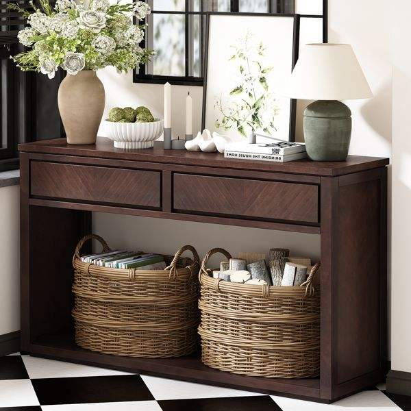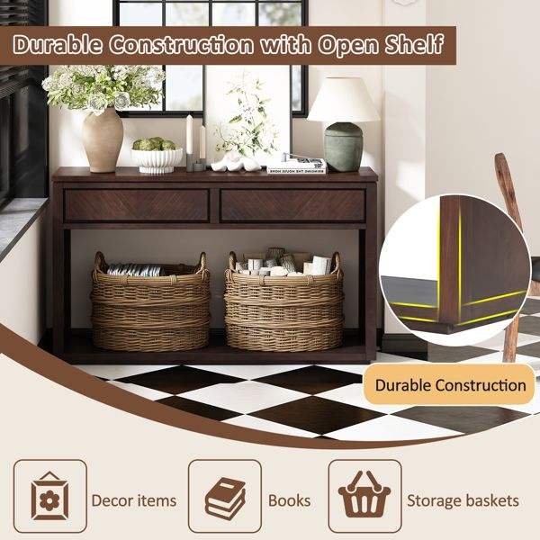 Mesa de consola de madera rústica Espresso de 55 \ ", elegante estante abierto, cajones de almacenamiento para entrada, pasillo o sala de estar, mesa de sofá