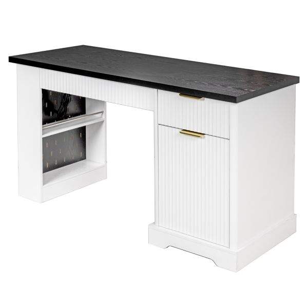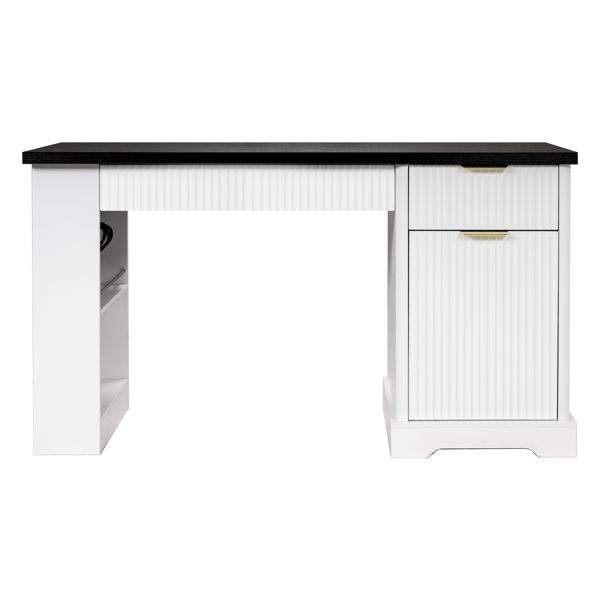 Escritorio de Oficina Moderno Acanalado de 55 Pulgadas con Gabinete de Almacenamiento, Cajones y Tomacorriente Integrado