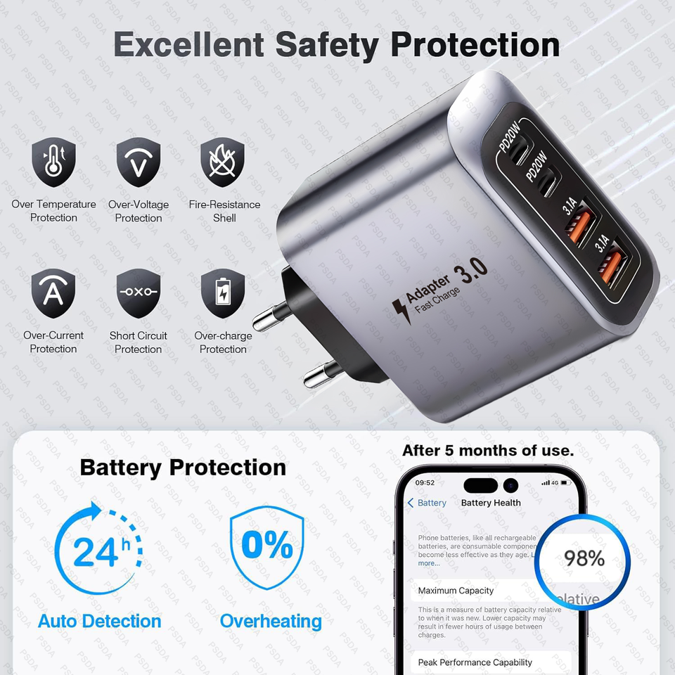 Adaptador de enchufe de viaje europeo de 55W USB C 55W USB C Cargador europeo Cargador rápido de 4 puertos Tipo C Cargador de pared Enchufe de EE. UU. a Europa