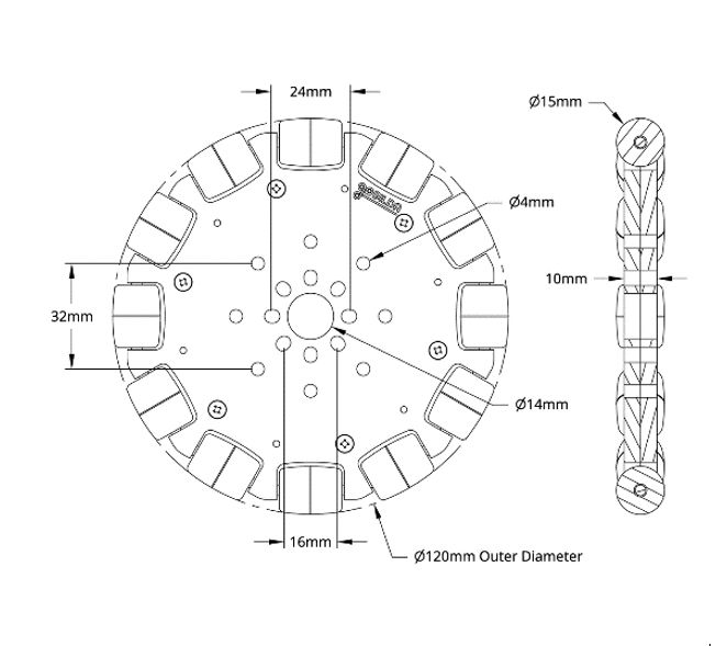 Rueda Omni Serie 5604 (Diámetro Interior de 14 mm, Diámetro Exterior de 120 mm) Robot STEM REV WCP FTC FRC