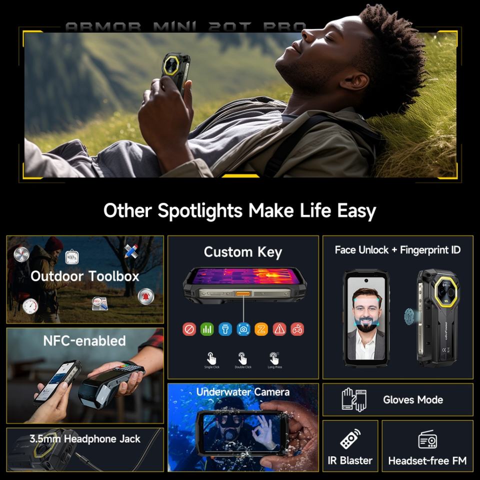 Teléfono Móvil 5G Android 14 Resistente al Agua con Cámara Termográfica FLIR, 8+256GB, 6200mAh, Carga Rápida de 33W, Ulefone Armor Mini 20T Pro