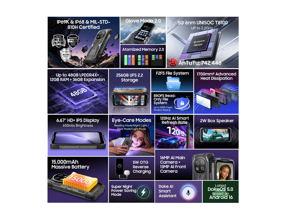 Teléfono Móvil Resistente 5G de 6.67 Pulgadas, 12+256GB, 15000mAh, Android 16, Smartphone con Pantalla de 120HZ, Blackview Rock 2