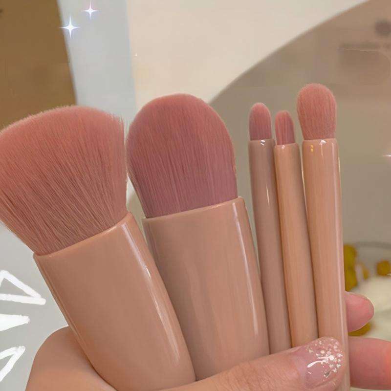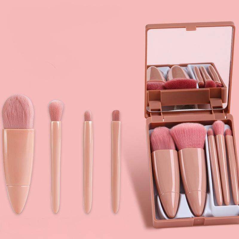Juego de 5 mini brochas de maquillaje rosas con estuche con espejo, kit de brochas cosméticas portátiles de viaje para base y sombra de ojos