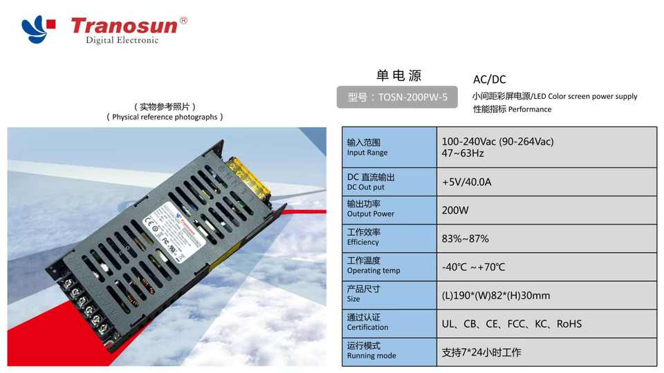 Fuente de Alimentación Conmutada AC-DC de 5V40A para Pantalla LED TOSN-200PW-5, Entrada de 90V-264V 50/60Hz, con Certificación FCC KC y 1 Año de Garantía