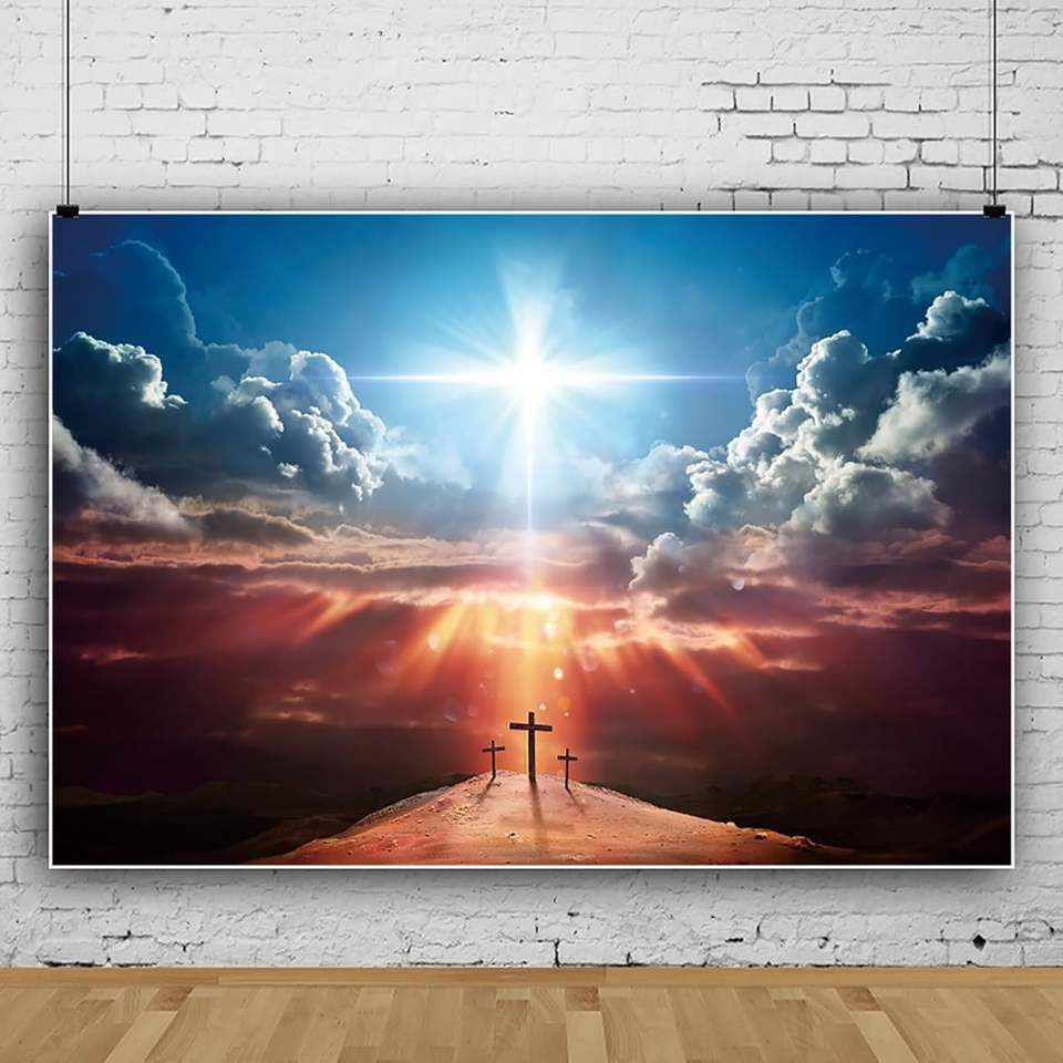 5x3ft Christian Photo Booth Props Jesucristo Cruz Luces sagradas Tres cruces Montaña Cielo Nube Fondo Sepulcro Señor Orar