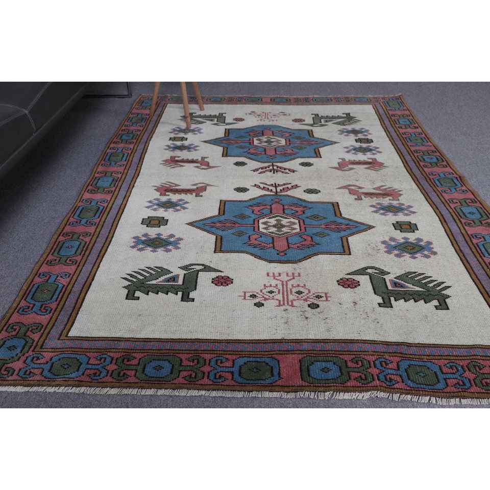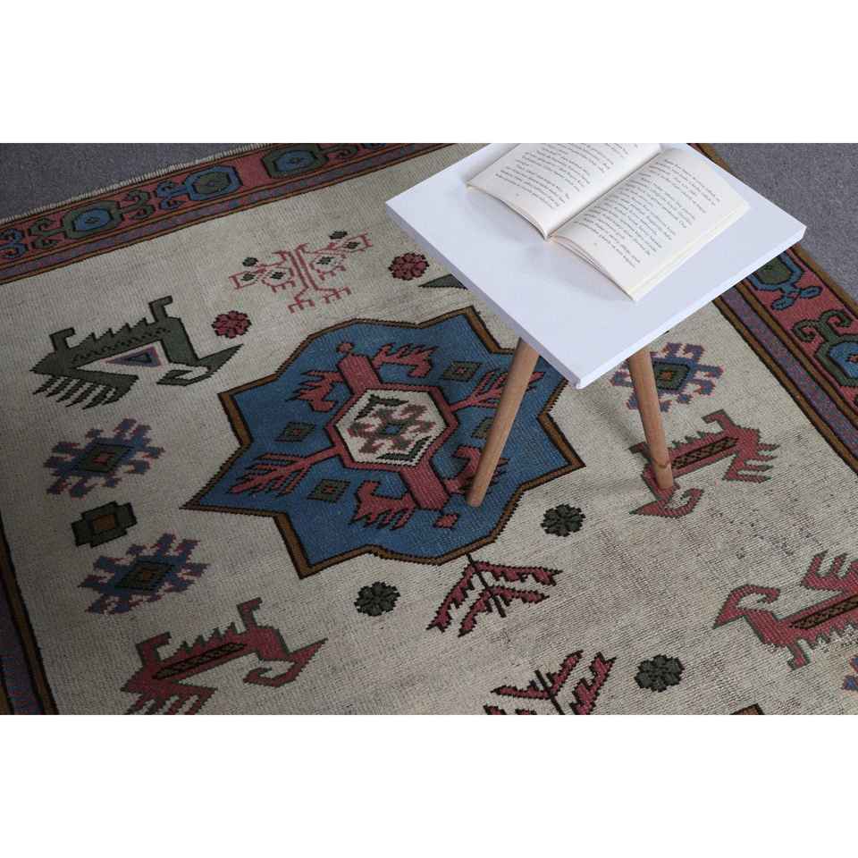 Alfombra turca de 5x7.1 pies, alfombra vintage, alfombra de lana con motivos de plantas y árboles en azul y rojo.