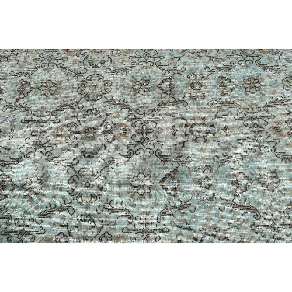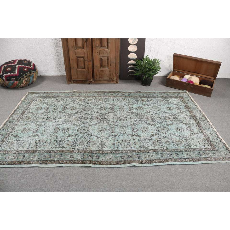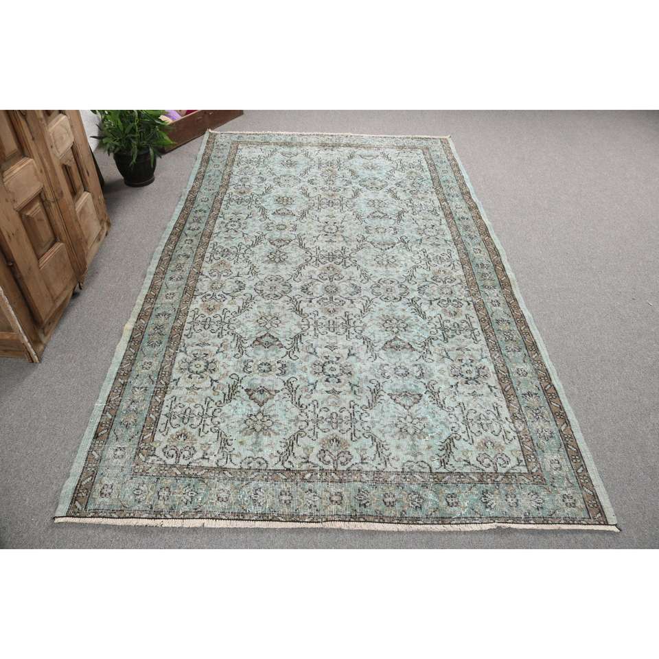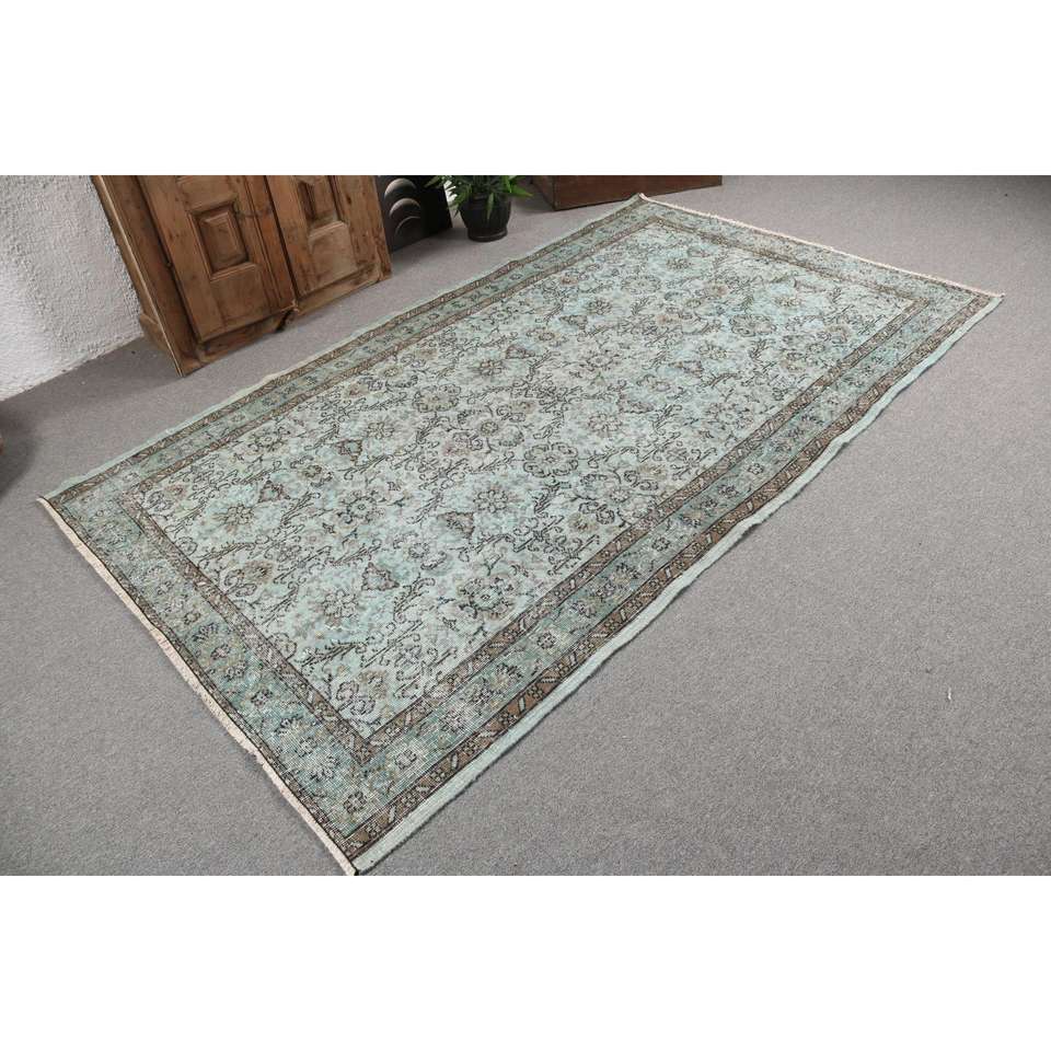 Alfombra Turca Oriental Vintage Grande de Lana, 5x8.3 pies, Diseño de Parches Azul y Marrón, Base de Látex, Ecológica, Pelo Medio, Hecha a Mano