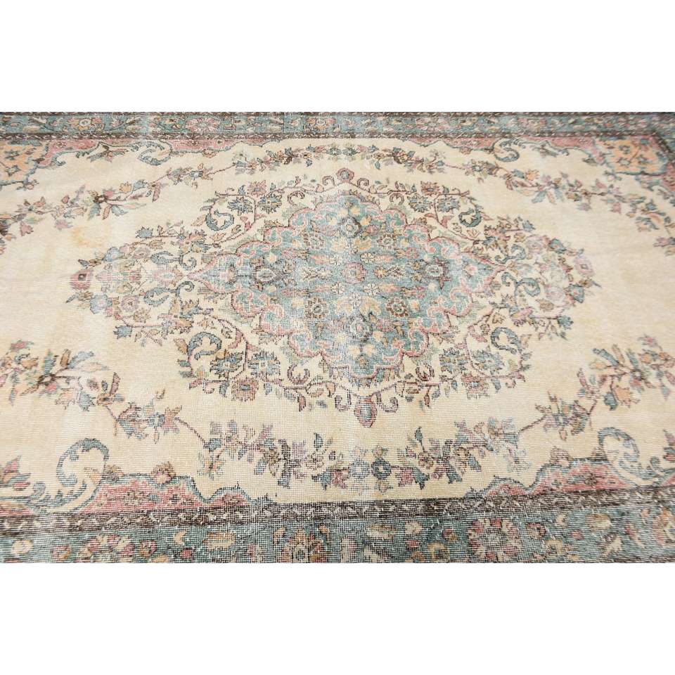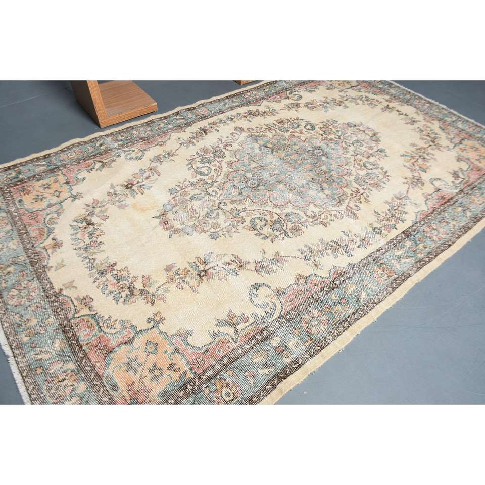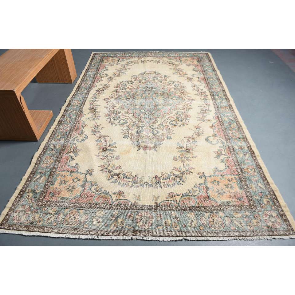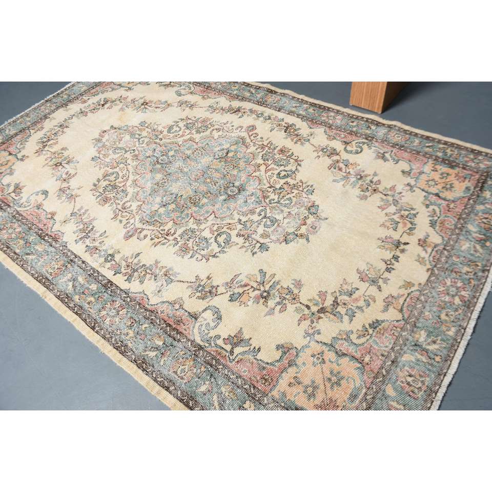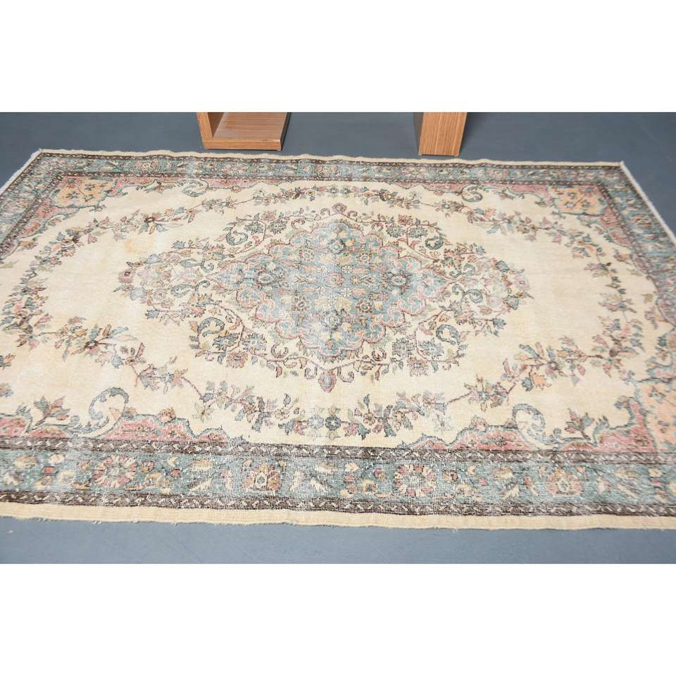 Alfombra Turca de 6.1x9.5 pies, Alfombra Vintage, Alfombra de Lana con Diseño Floral Azul