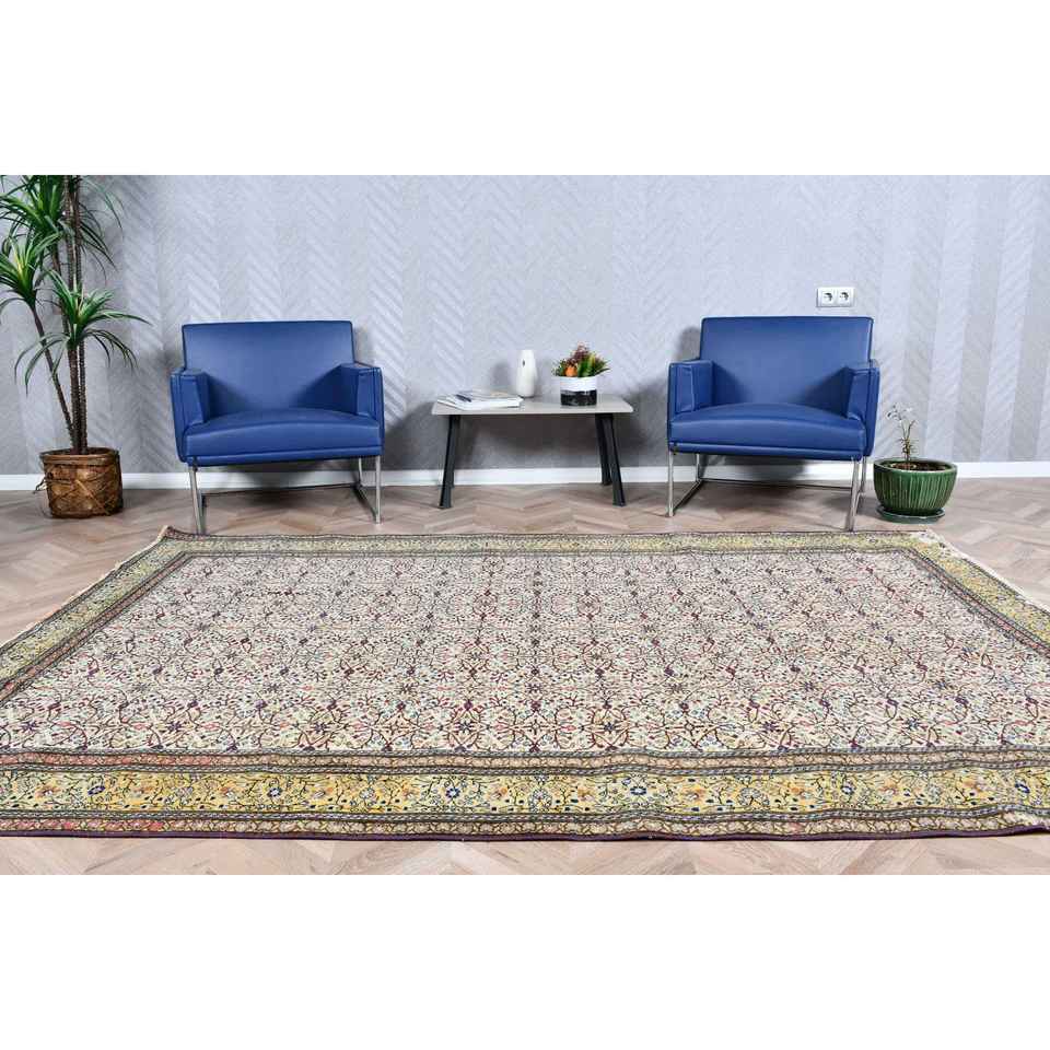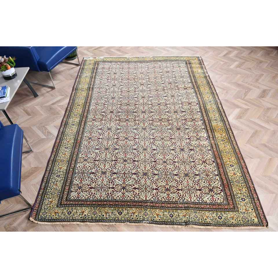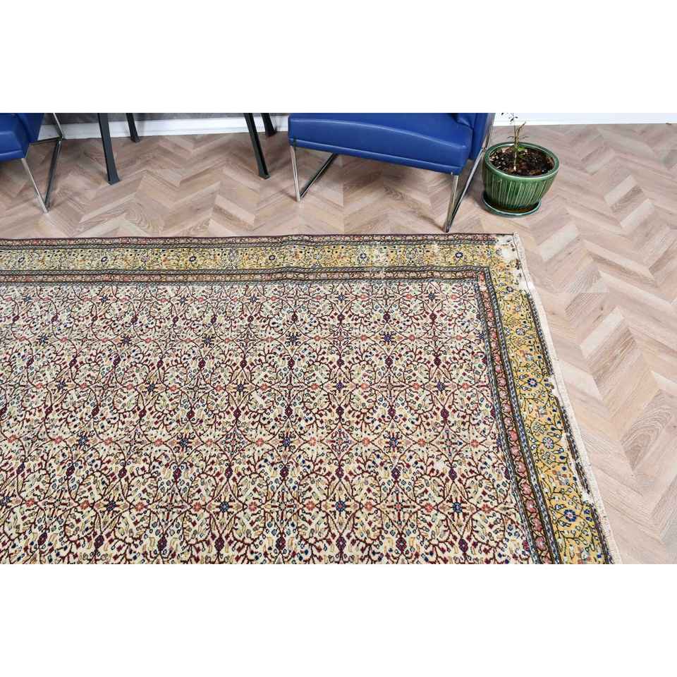 Alfombra Vintage de 6.4x9.1 pies, Alfombra Turca Grande, Alfombra con Puntos Amarillos y Azules