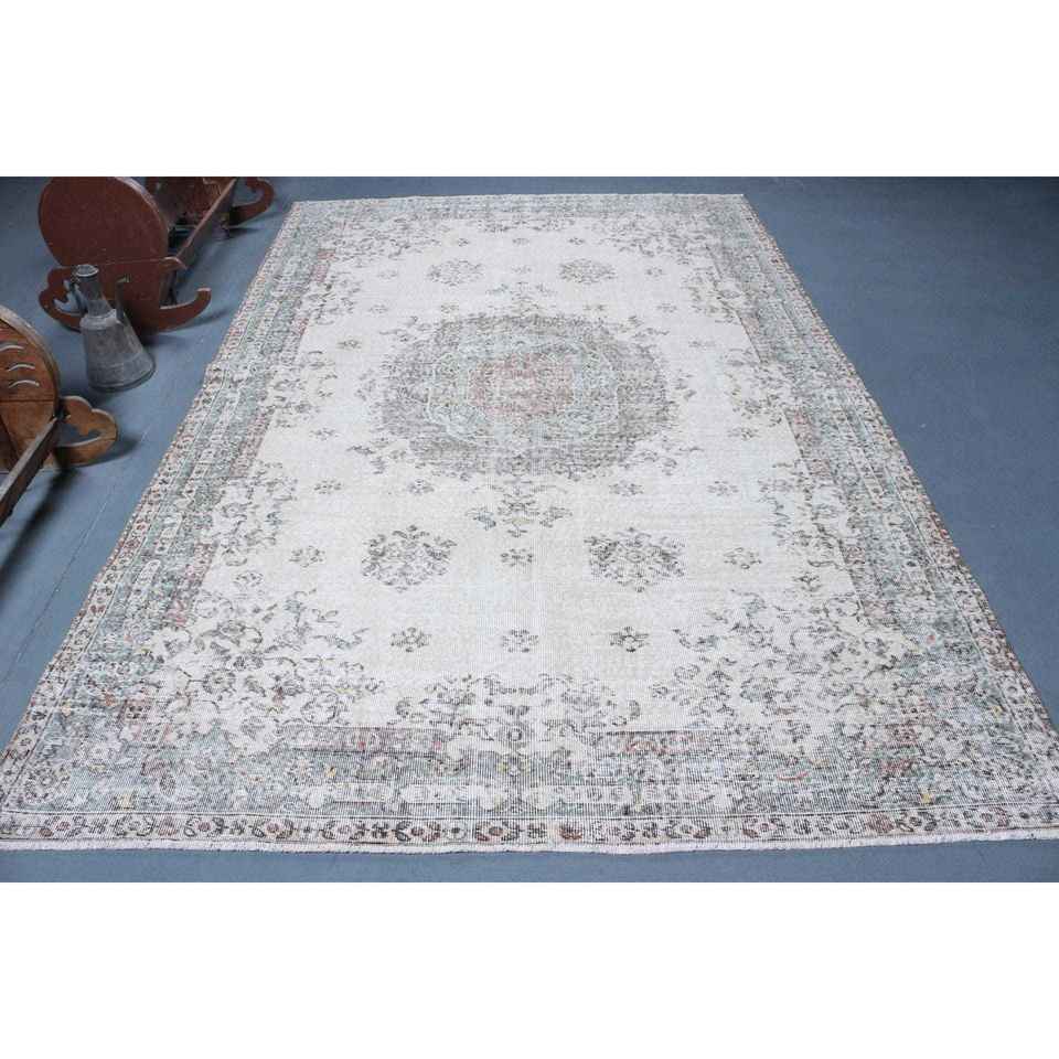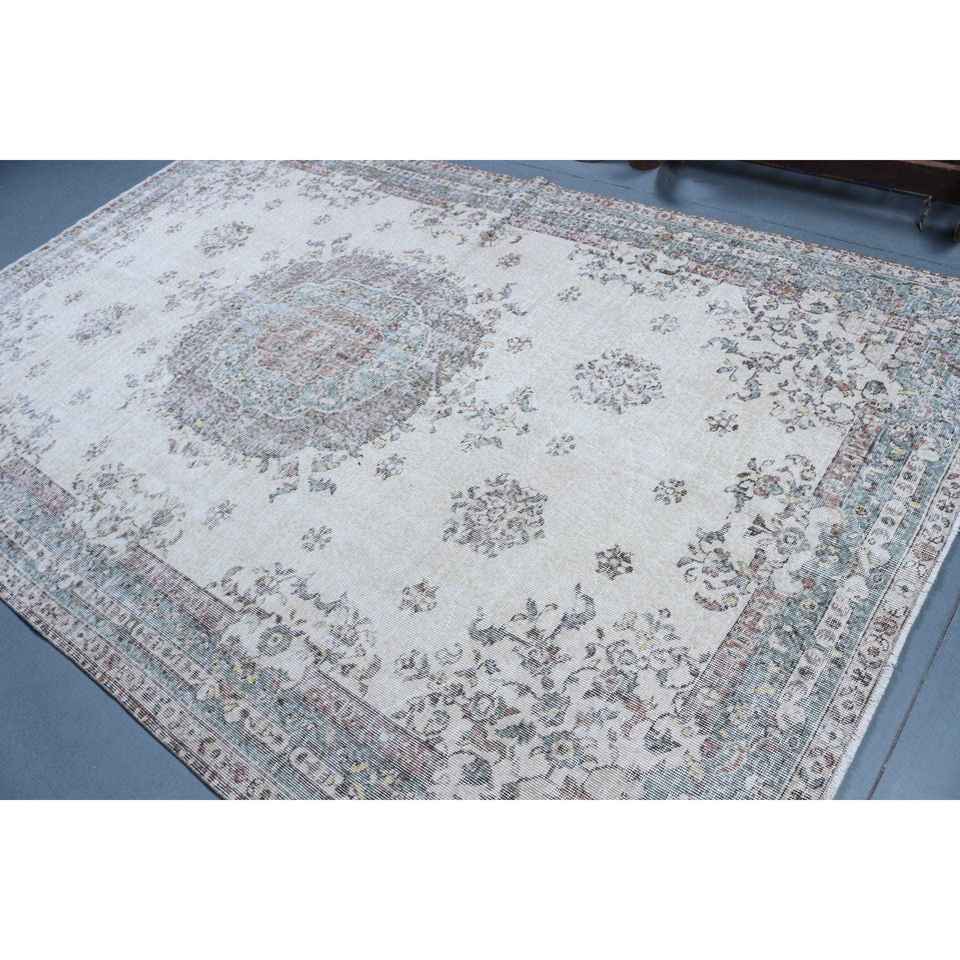 Alfombra de 6.4x9.9 pies, Alfombra Turca Vintage, Alfombra de Lana con Diseño Floral Blanco y Azul