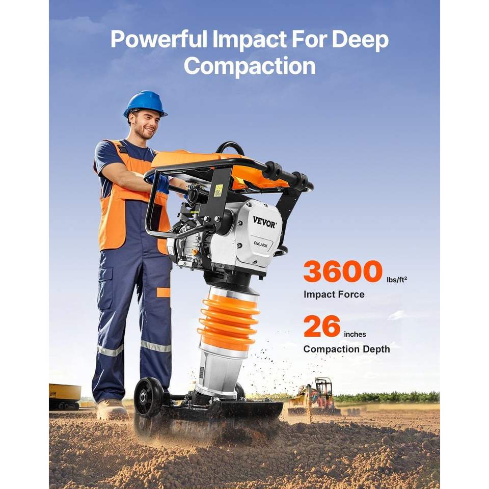 Compactador Vibratorio de 6.5 HP, 196 cc, a Gasolina, con Fuerza de Impacto de 3600 Libras y Profundidad Máxima de Compactación de 26 Pulgadas