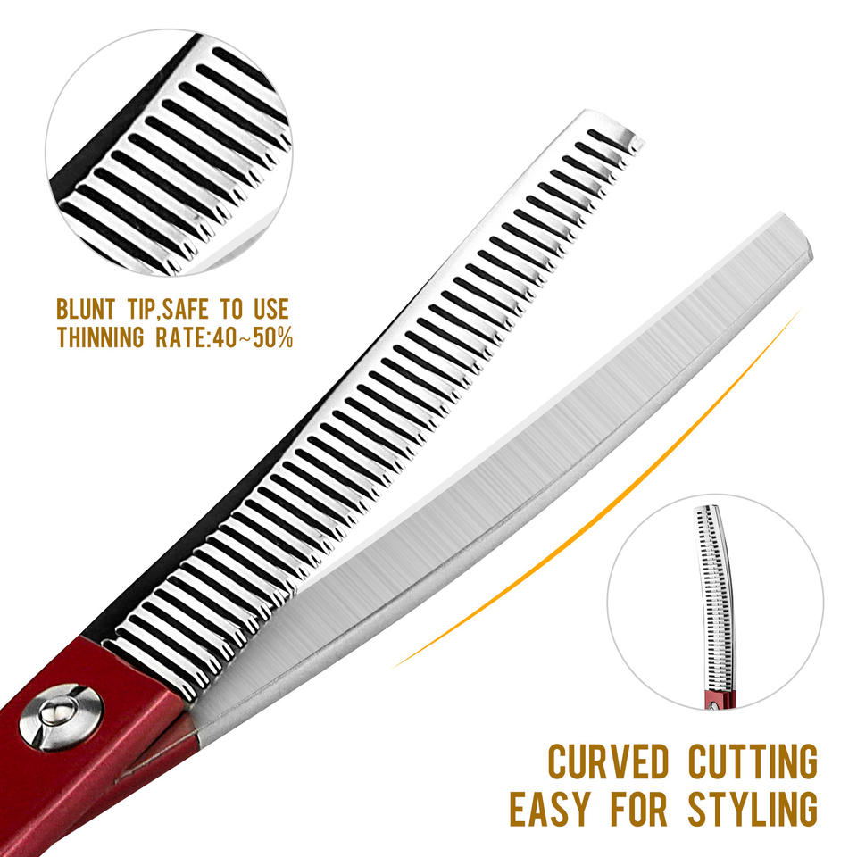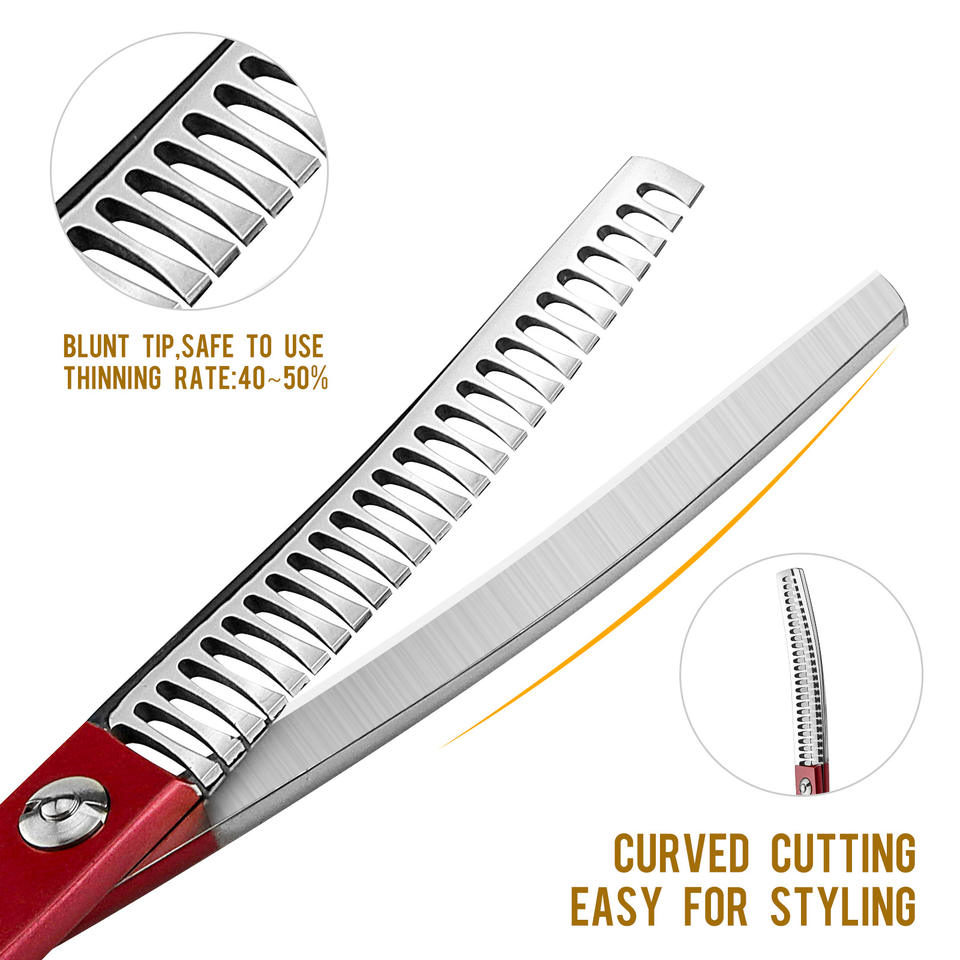 Tijeras de Entresacar para Mascotas de Acero Inoxidable con Hoja de 6.5 Pulgadas, Estilo Medon, Mango Rojo y Dientes Curvos Tipo Espina de Pescado