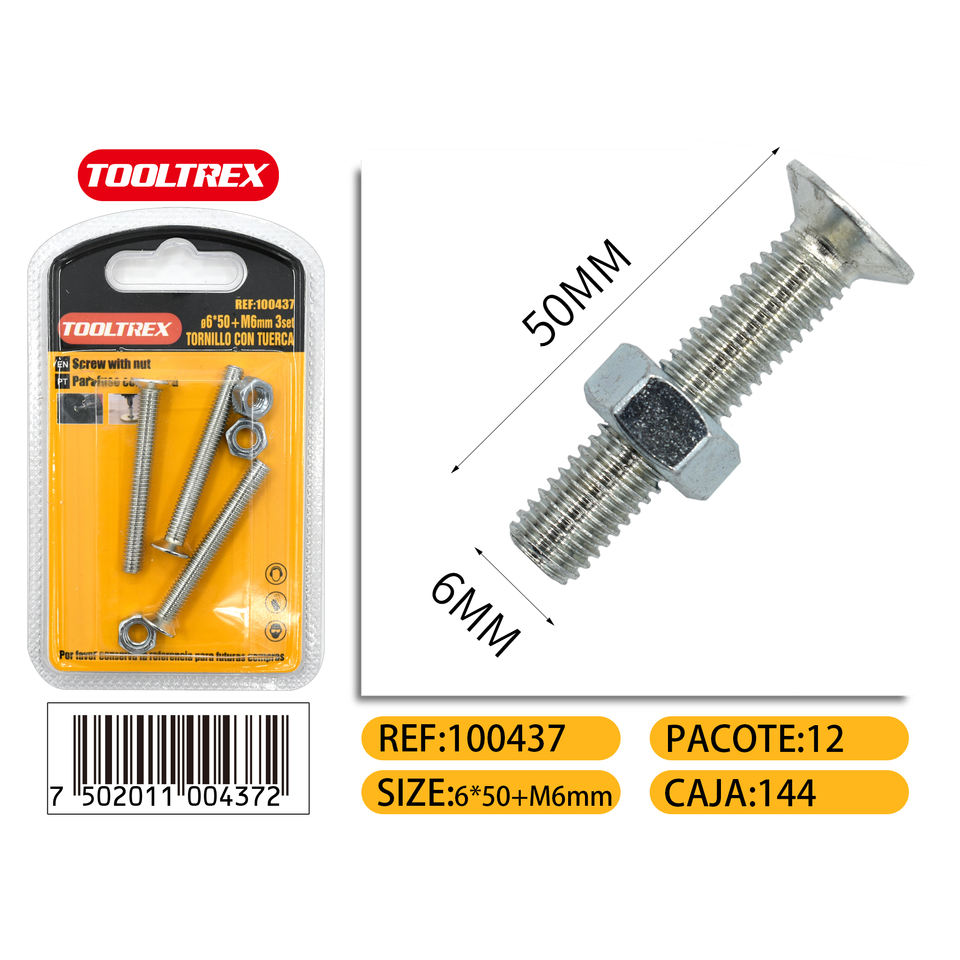 Juego de 3 tornillos de máquina de cabeza plana avellanada M6 de 6x50mm con tuerca, cincados con óxido negro, tamaños de rosca M1.6, M2.5, M3.5