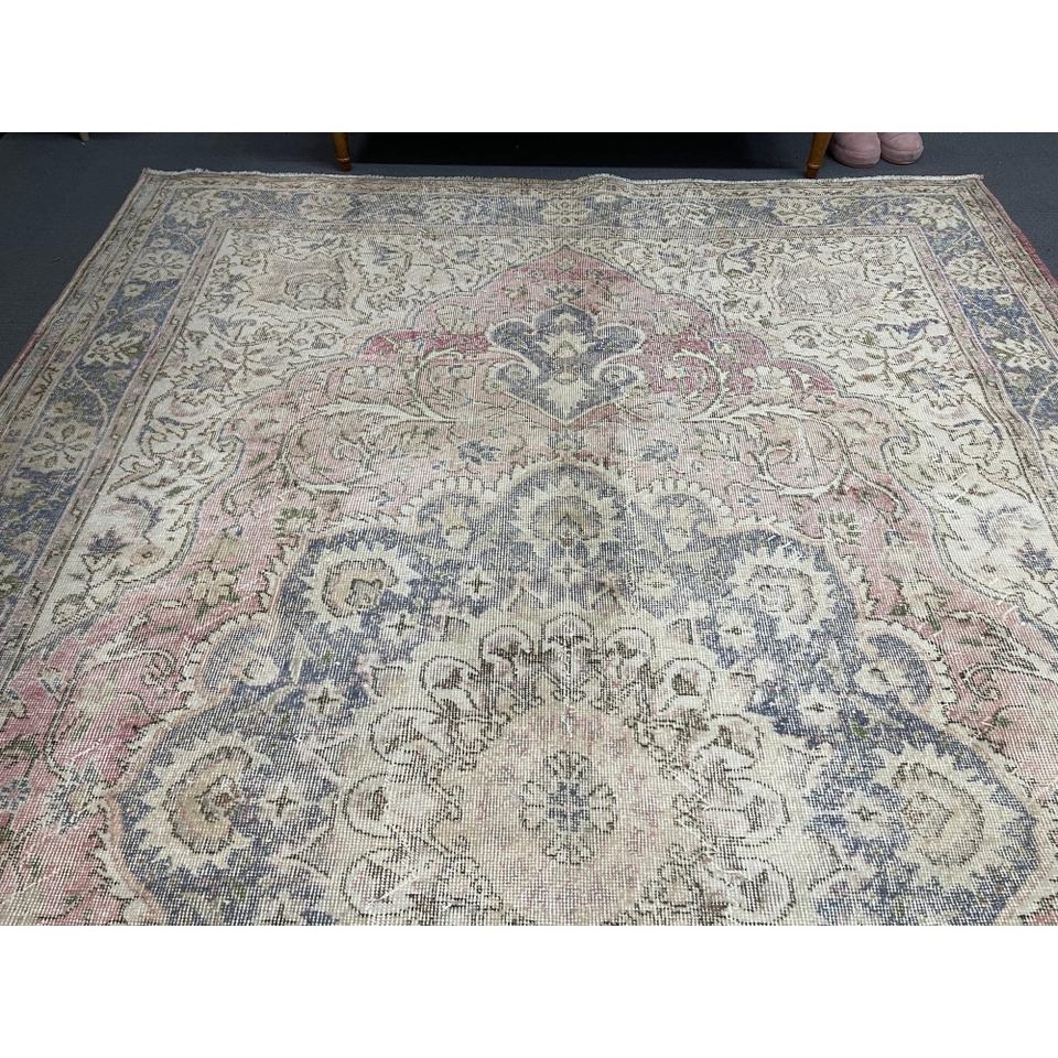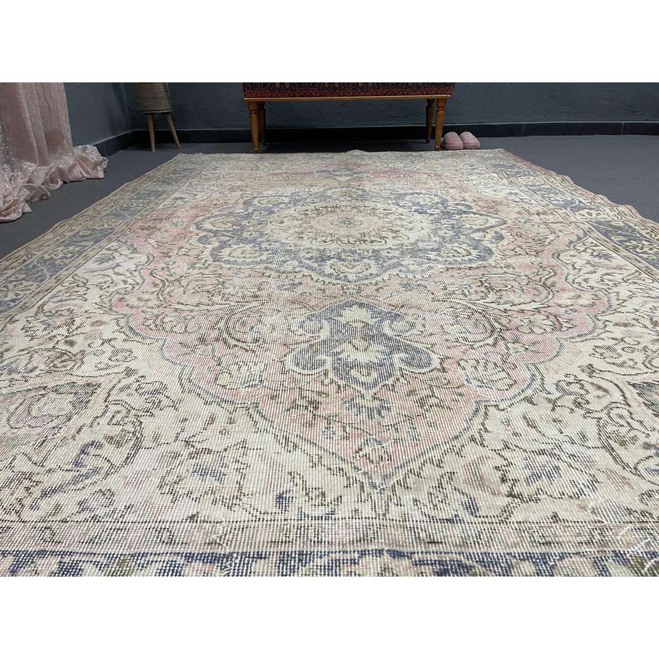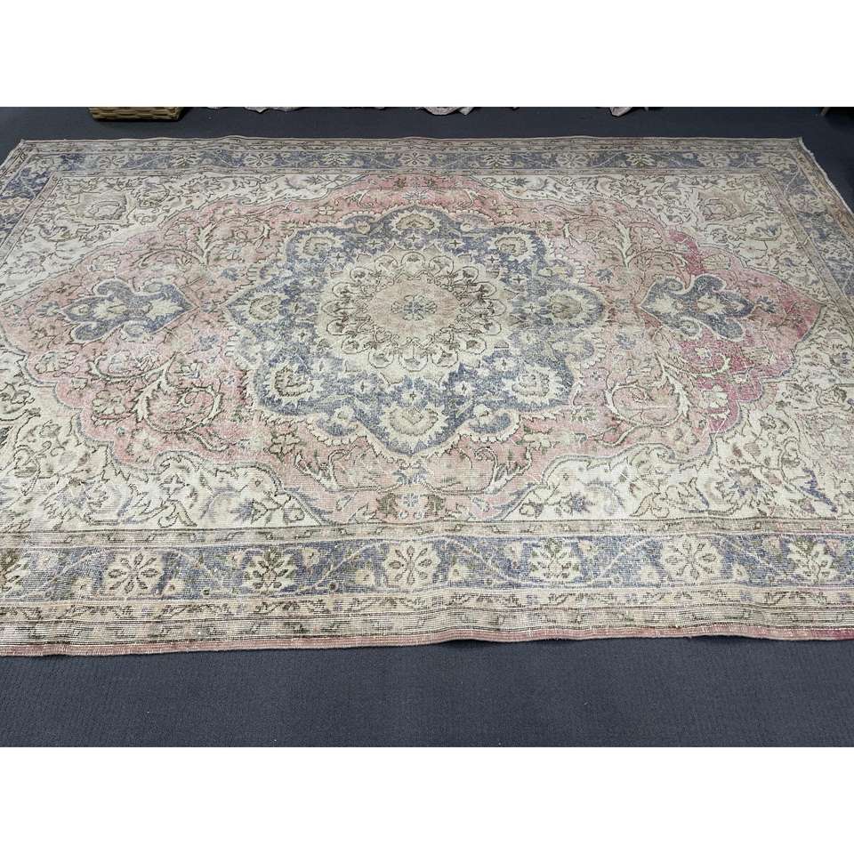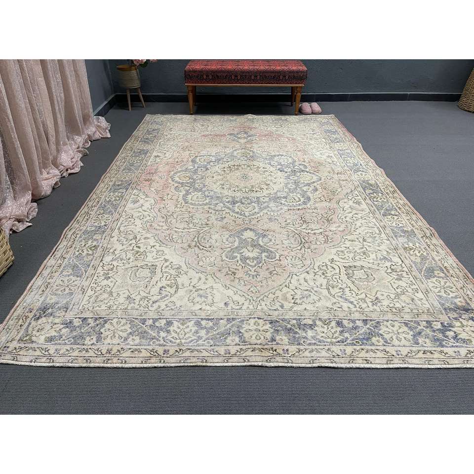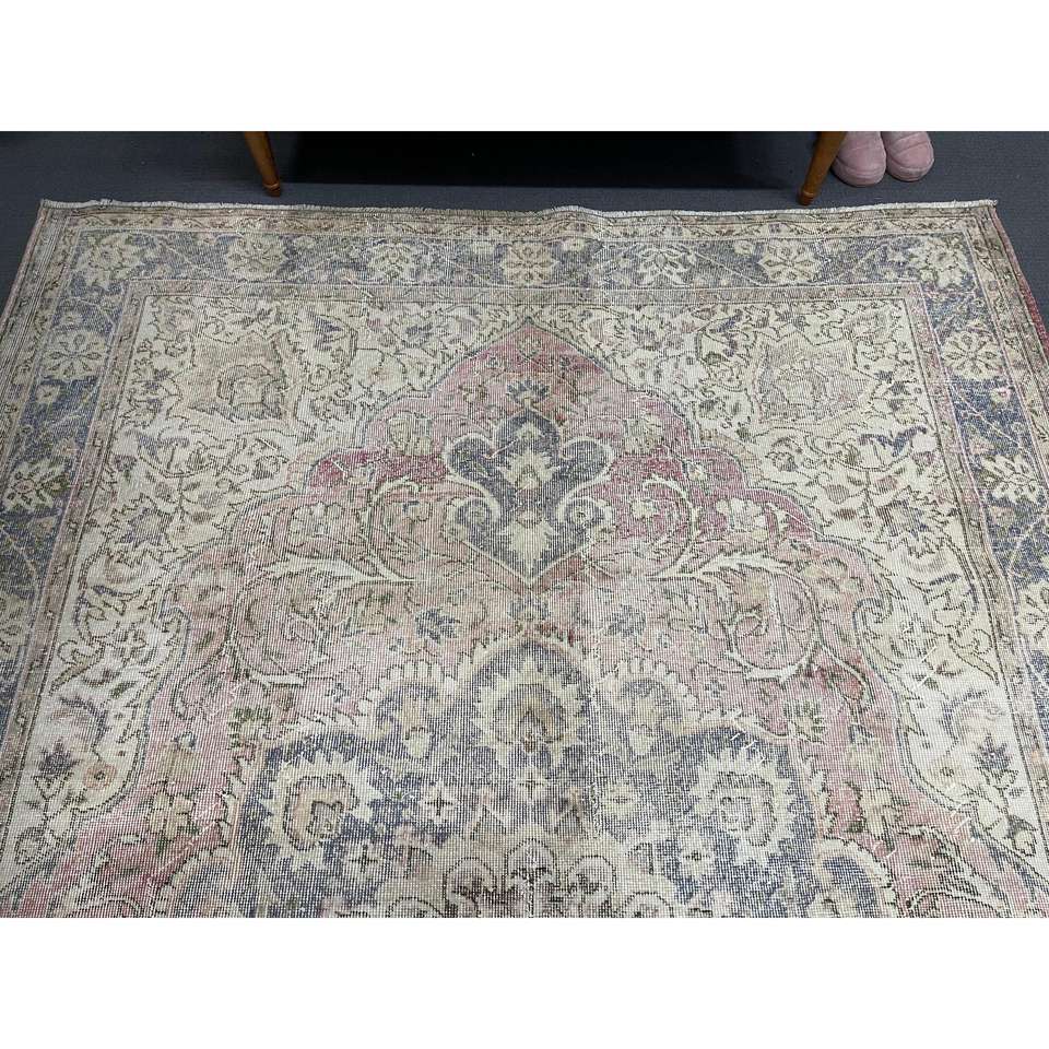 Alfombra turca de 6.6x10 pies, alfombra vintage, alfombra de lana con motivos de plantas y árboles azules