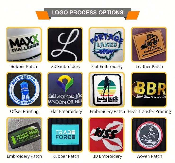 Posición del logotipo:Ala/visera, Panel frontal, Panel izquierdo, Panel derecha, Parte trasera curva, Personalizado