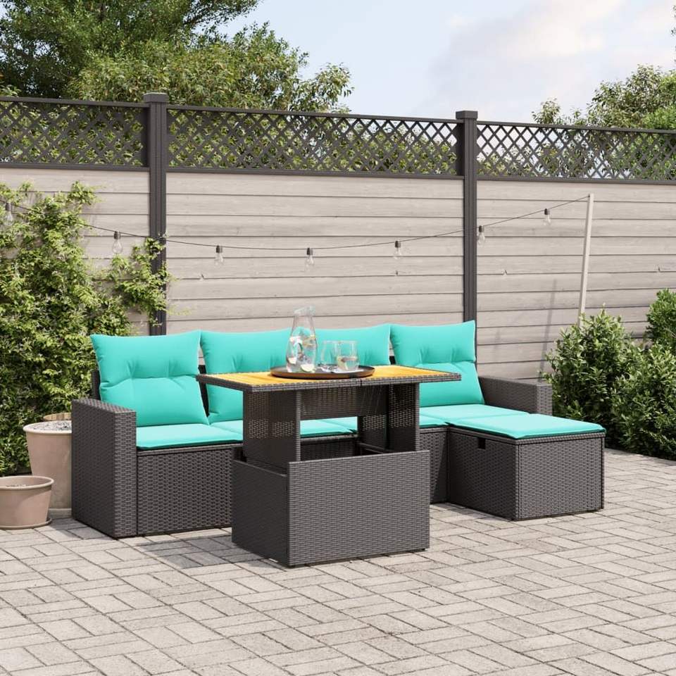 Juego de sofás de patio de ratán sintético negro de 6 piezas con cojines, muebles de exterior