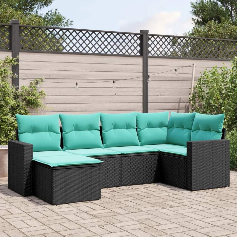 Juego de sofás de patio de ratán sintético negro de 6 piezas con cojines, muebles de exterior