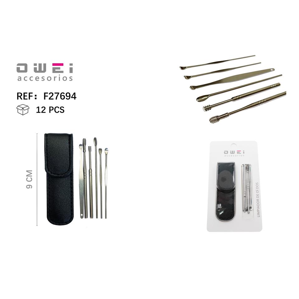 Juego de púas de oreja de metal de 6 piezas con estuche de cuero para una extracción conveniente de cera de oído