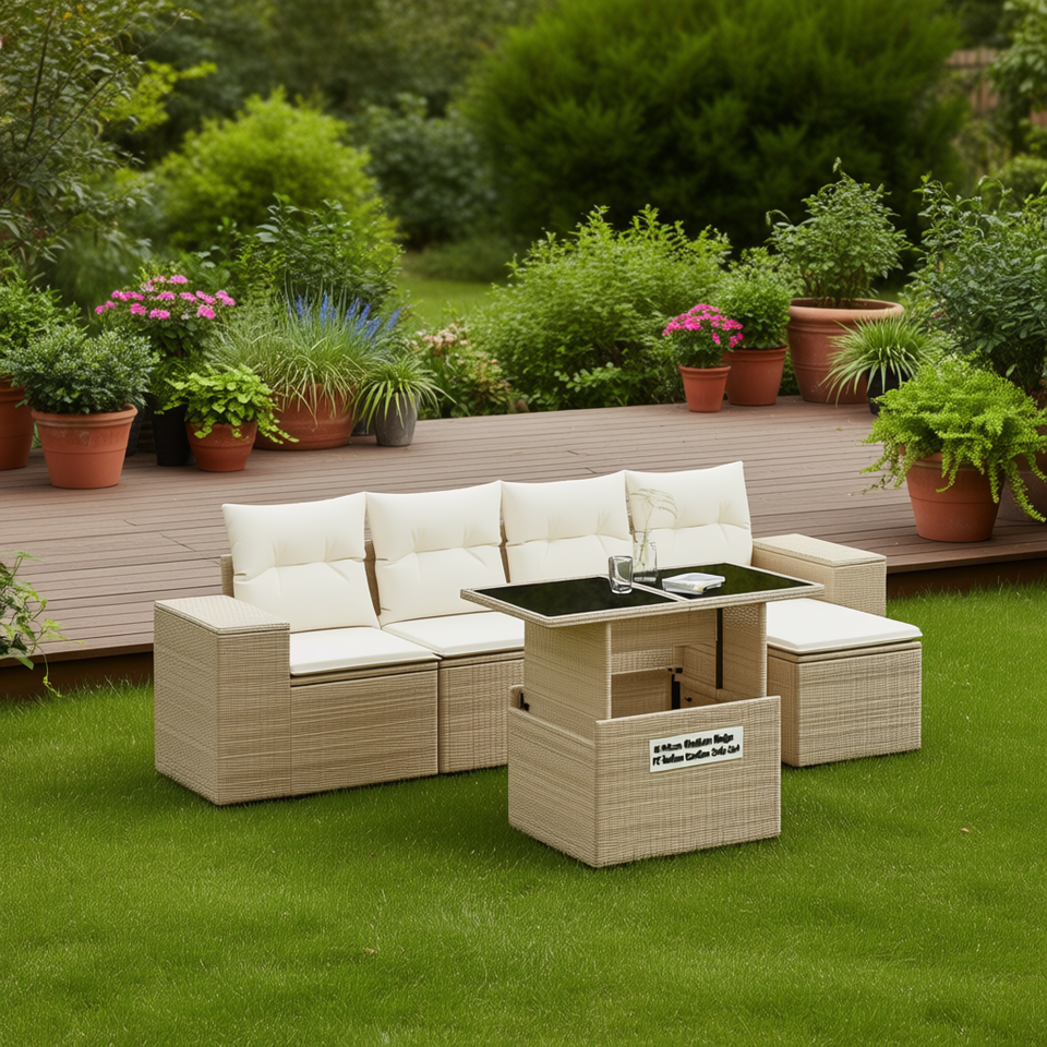 Juego de Sofás Modulares de Jardín de 6 Piezas en Ratán Sintético PE Beige, Muebles de Exterior Estilo Mediterráneo Resistentes a la Intemperie