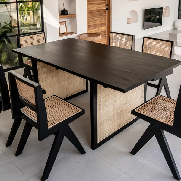 Mesa de comedor de ratán para 6 personas con construcción duradera, diseño elegante tejido, asientos cómodos y un estilo perfecto.