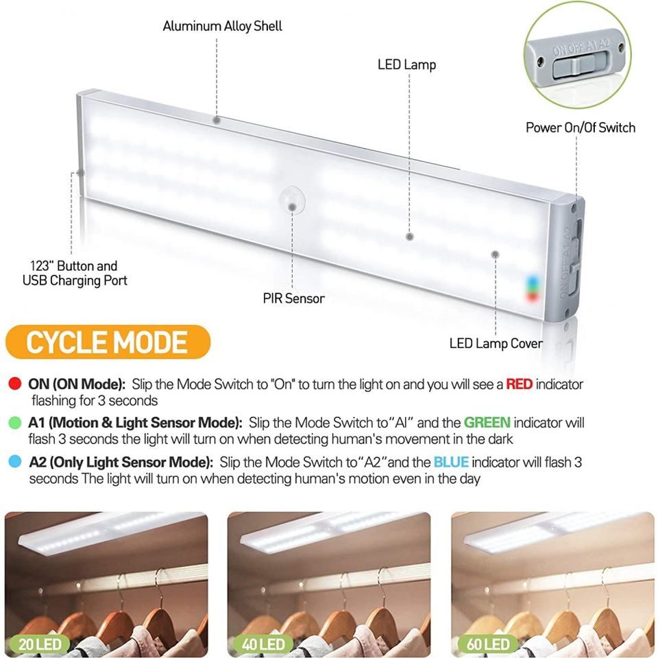 Lámpara Nocturna LED con Sensor de Movimiento Magnético Recargable por USB de 60 LED, Luz para Armario, Guardarropa, Luces LED Debajo del Gabinete