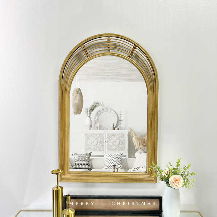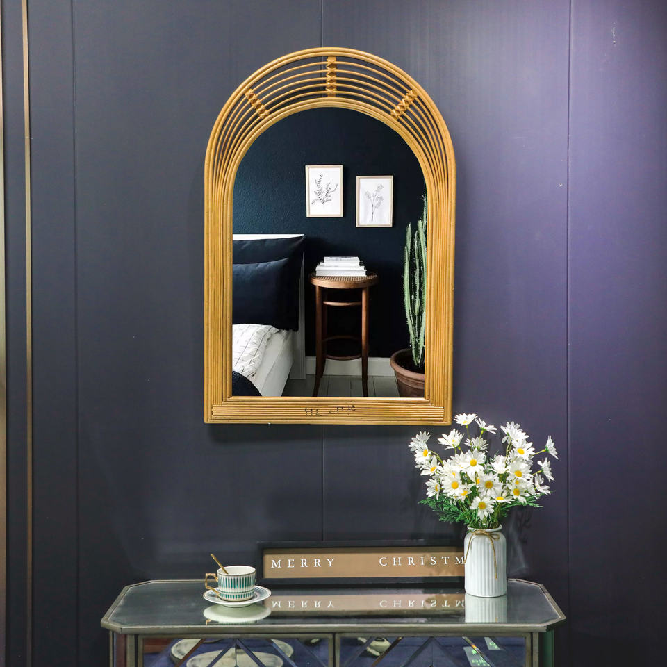 Espejos de pared de longitud completa de madera de bambú natural decorativos ecológicos de 60x90cm, espejo vertical de arco de bambú grande para Baño