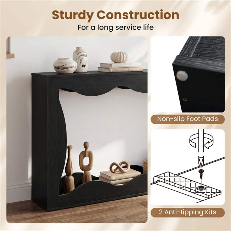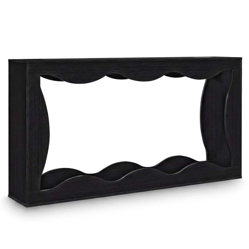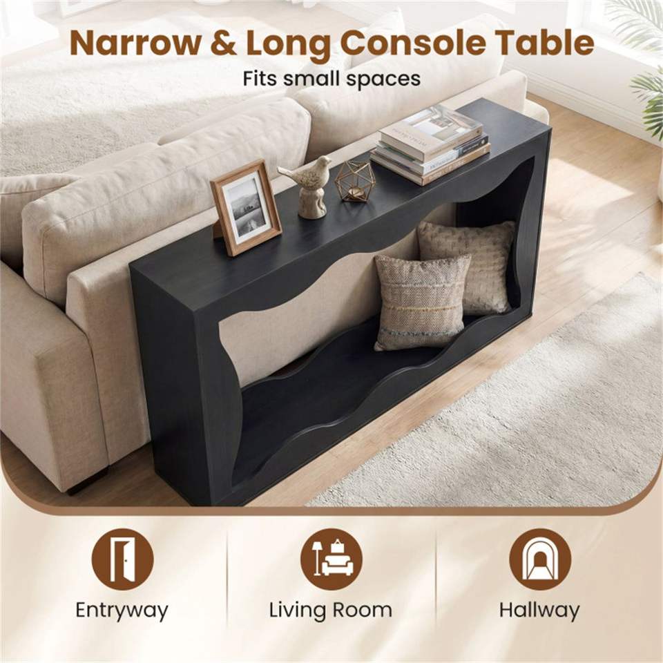 Mesa Consola Negra Extra Larga de 63 Pulgadas con Diseño Ondulado Hueco y Estante de Almacenamiento para Entrada, Mesa Consola Estrecha de 2 Niveles