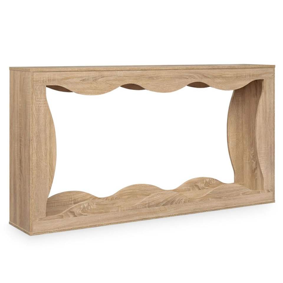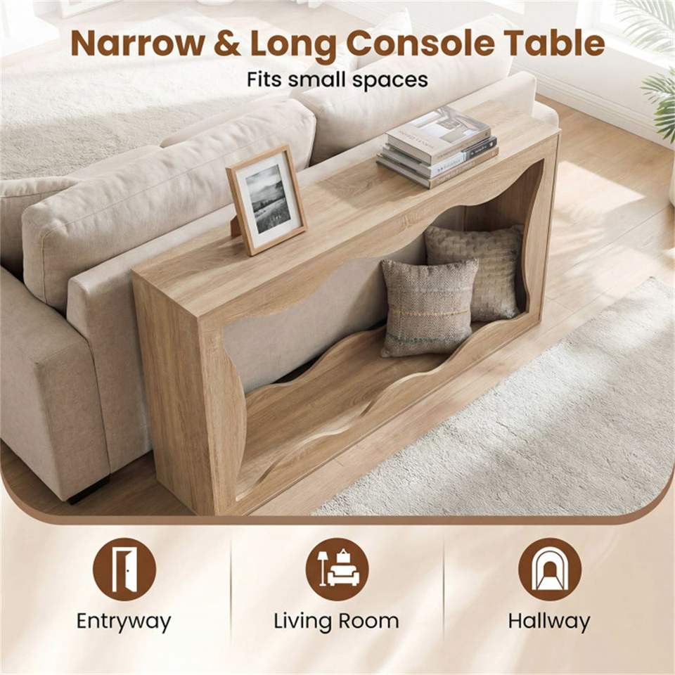 Mesa Consola Estrecha Natural de 63 Pulgadas con Diseño Ondulado Hueco, Mesa de Entrada Extra Larga de 2 Niveles con Estante de Almacenamiento