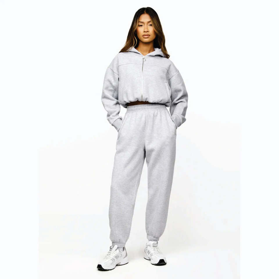 Sudadera con Capucha Deportiva Corta para Mujer, 65% Algodón, 35% Poliéster, Cierre Completo, Color Gris Jaspeado