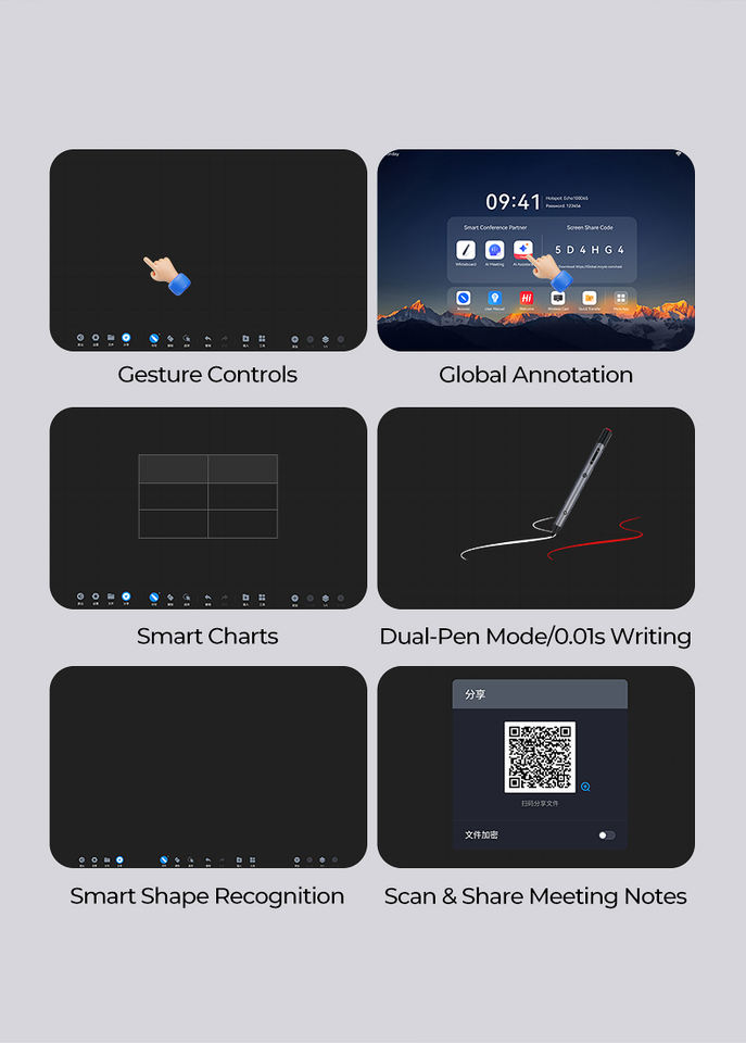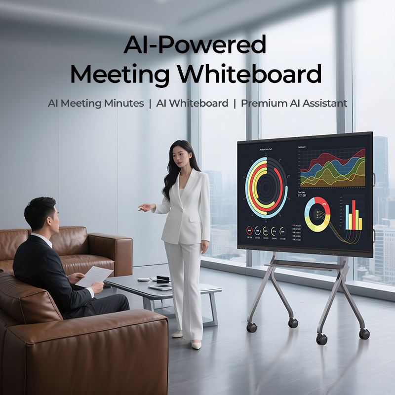 Panel Interactivo para Conferencias 4K de 65 Pulgadas, Pantalla Táctil Android 14, Pizarra Blanca 4+32G con Cámara, Minutas de Reuniones con IA