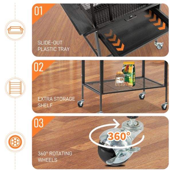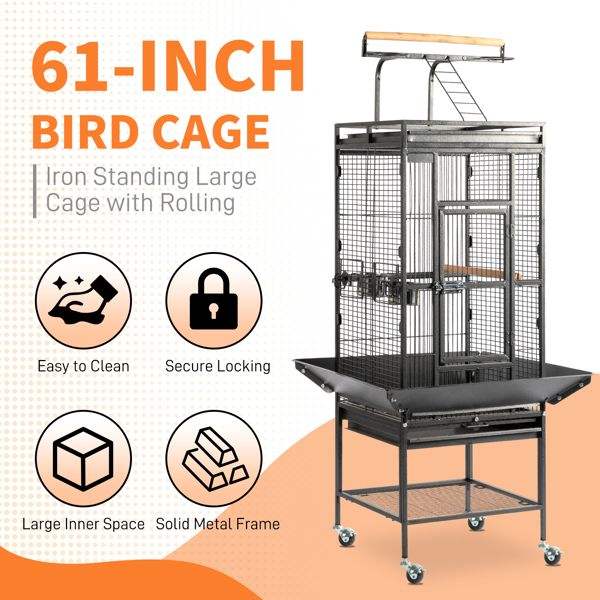 Jaula Grande de Hierro Forjado de 65 Pulgadas con Ruedas, Plataforma de Juego y Soporte, Negra, para Loros, Agapornis, Periquitos y Calopsitas