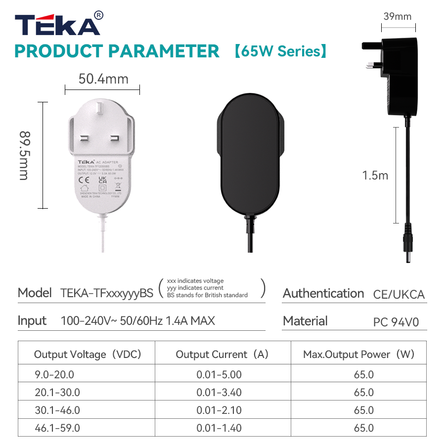 Adaptador de Corriente de 65W con Enchufe UK, Certificado BS UKCA, Salidas Ajustables de 12V-5A para Laptop, CCTV, Router, Dispositivos Inteligentes para el Hogar, Superventas